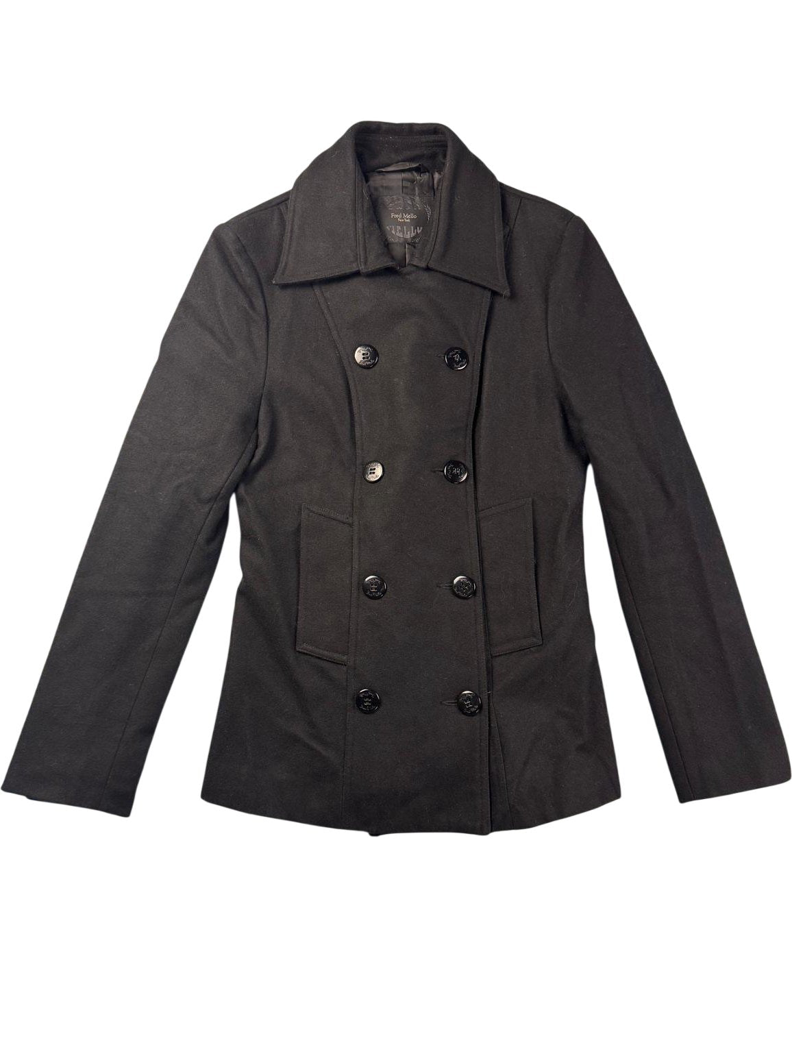 Classic black pea coat by Fred Mello New York. Features a double-breasted design with eight buttons. Tailored fit with a notched lapel collar, perfect for both formal and casual occasions.