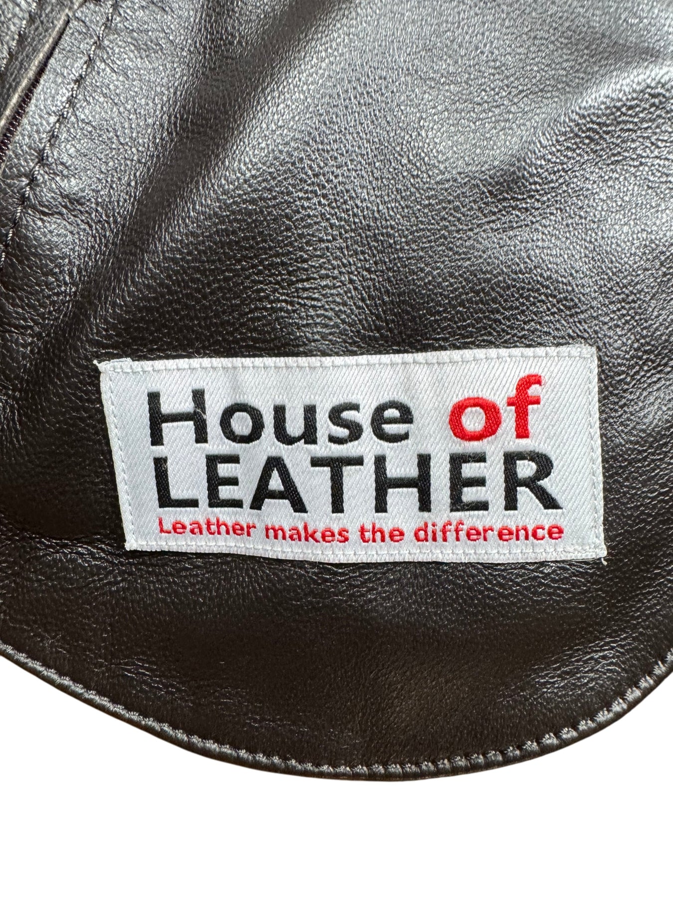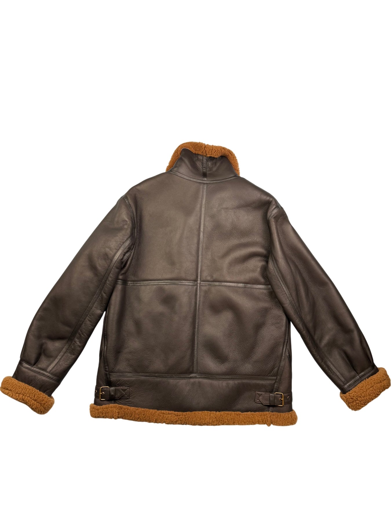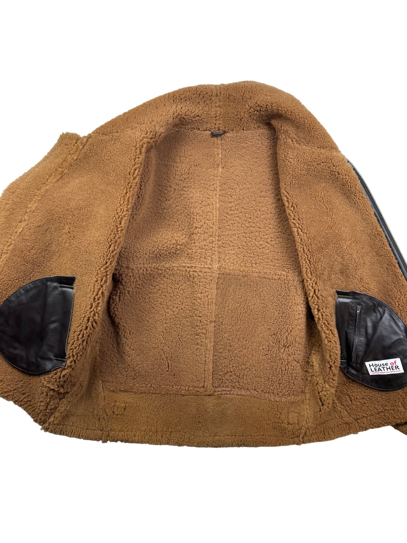 Brown leather bomber jacket with shearling lining and collar. Features two front pockets, zip closure, and adjustable waist straps. Made by House of Leather.