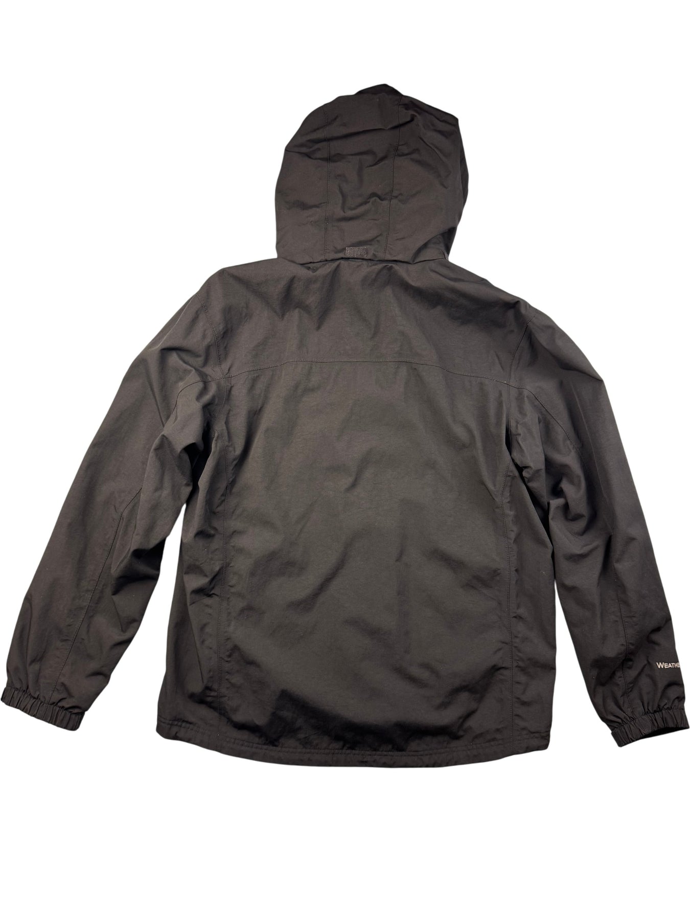Black rain coat with a hood by Karrimor. Features include a front zipper, side pockets, and adjustable cuffs. Made with waterproof material.