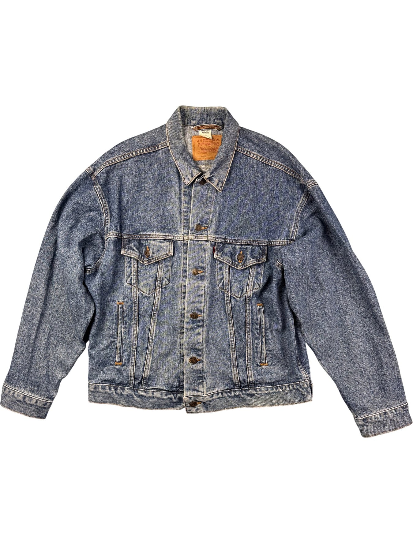 Classic Levi Strauss denim jacket made from 100% cotton. Features include a button-front closure, dual flap chest pockets, and button cuffs. Assembled in Mexico with U.S. components.