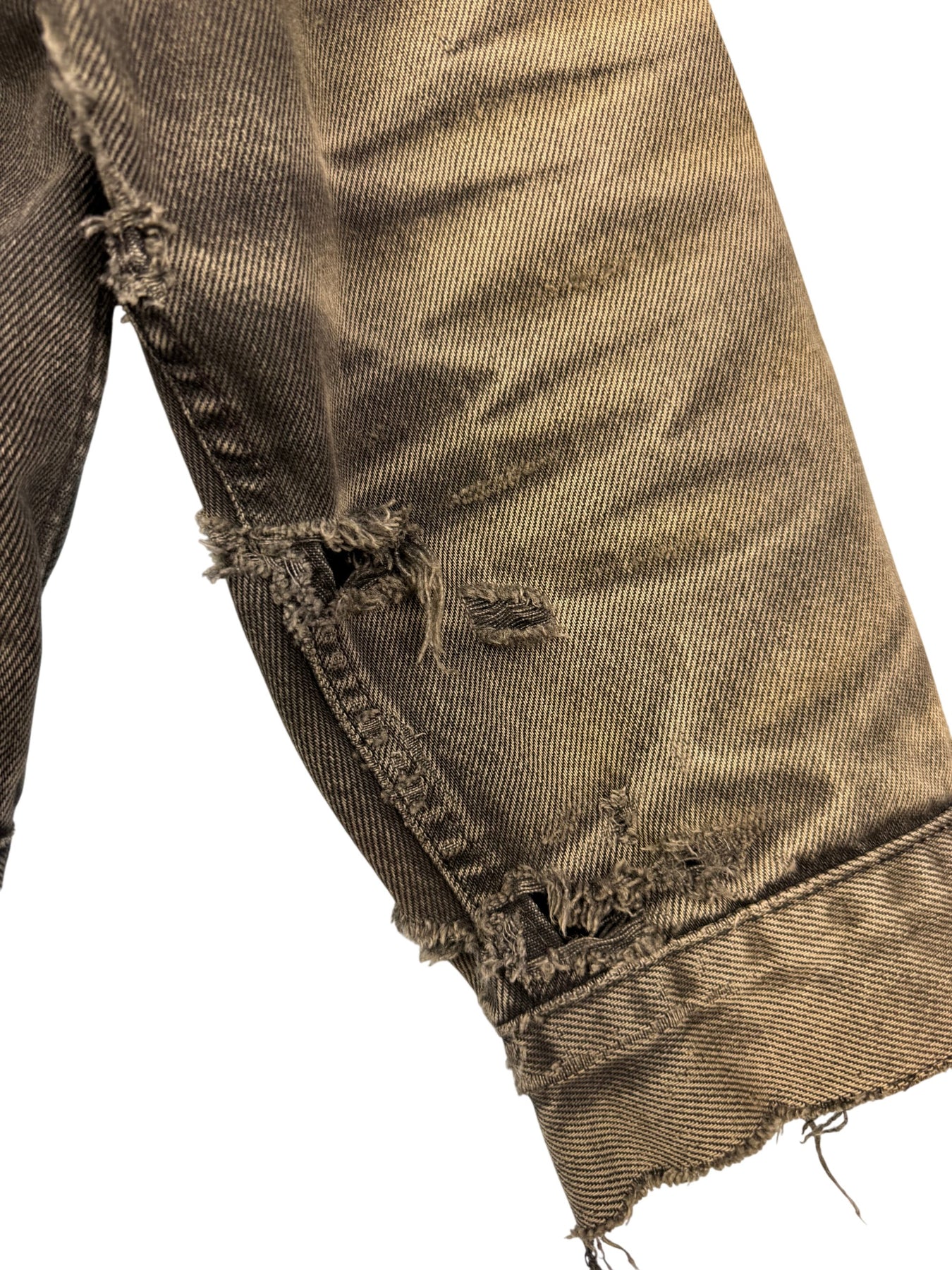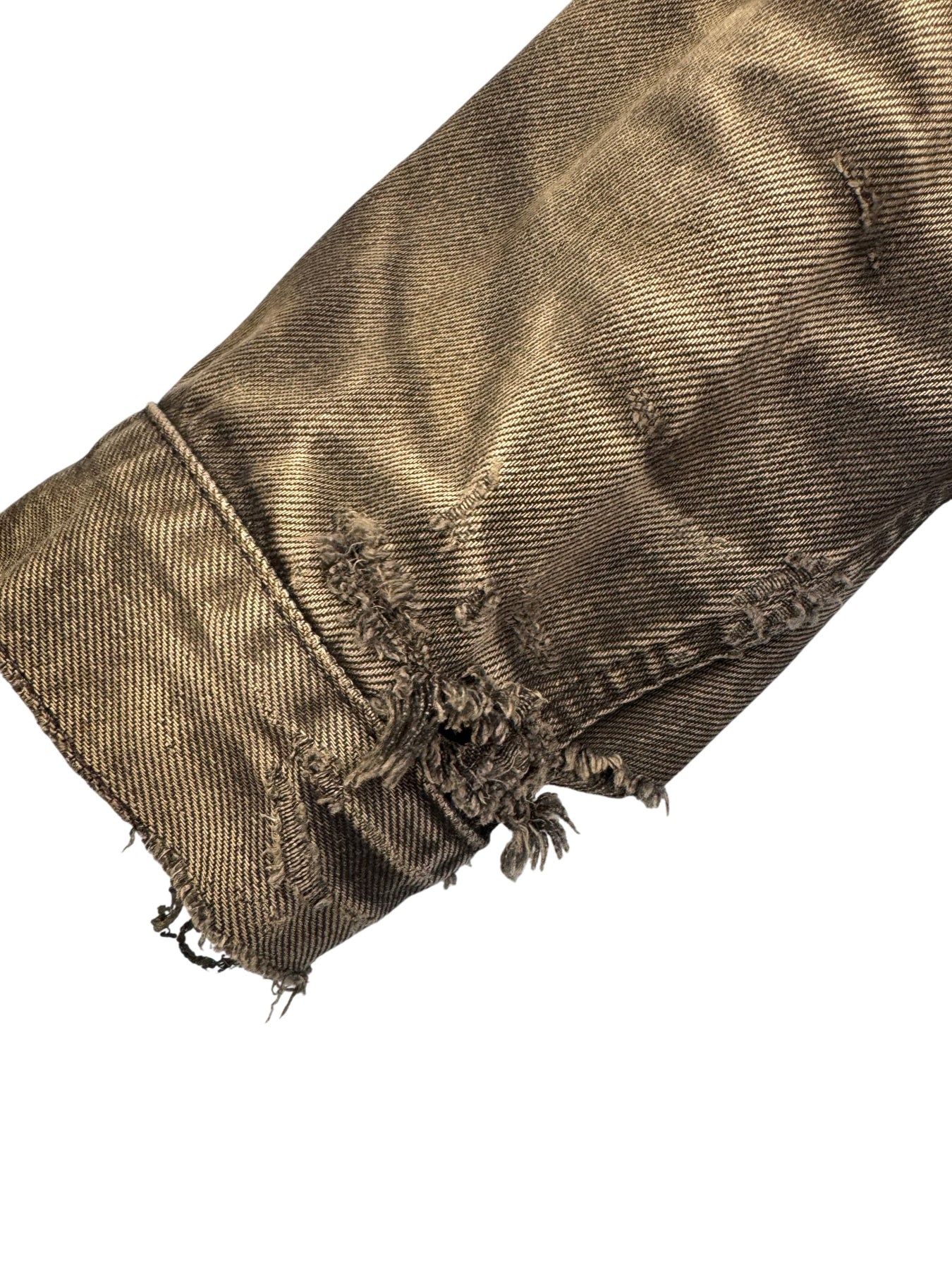 Classic denim trucker jacket with button closure and two front flap pockets. Distressed detailing on the sleeves and back for a rugged look. Made of durable denim fabric.