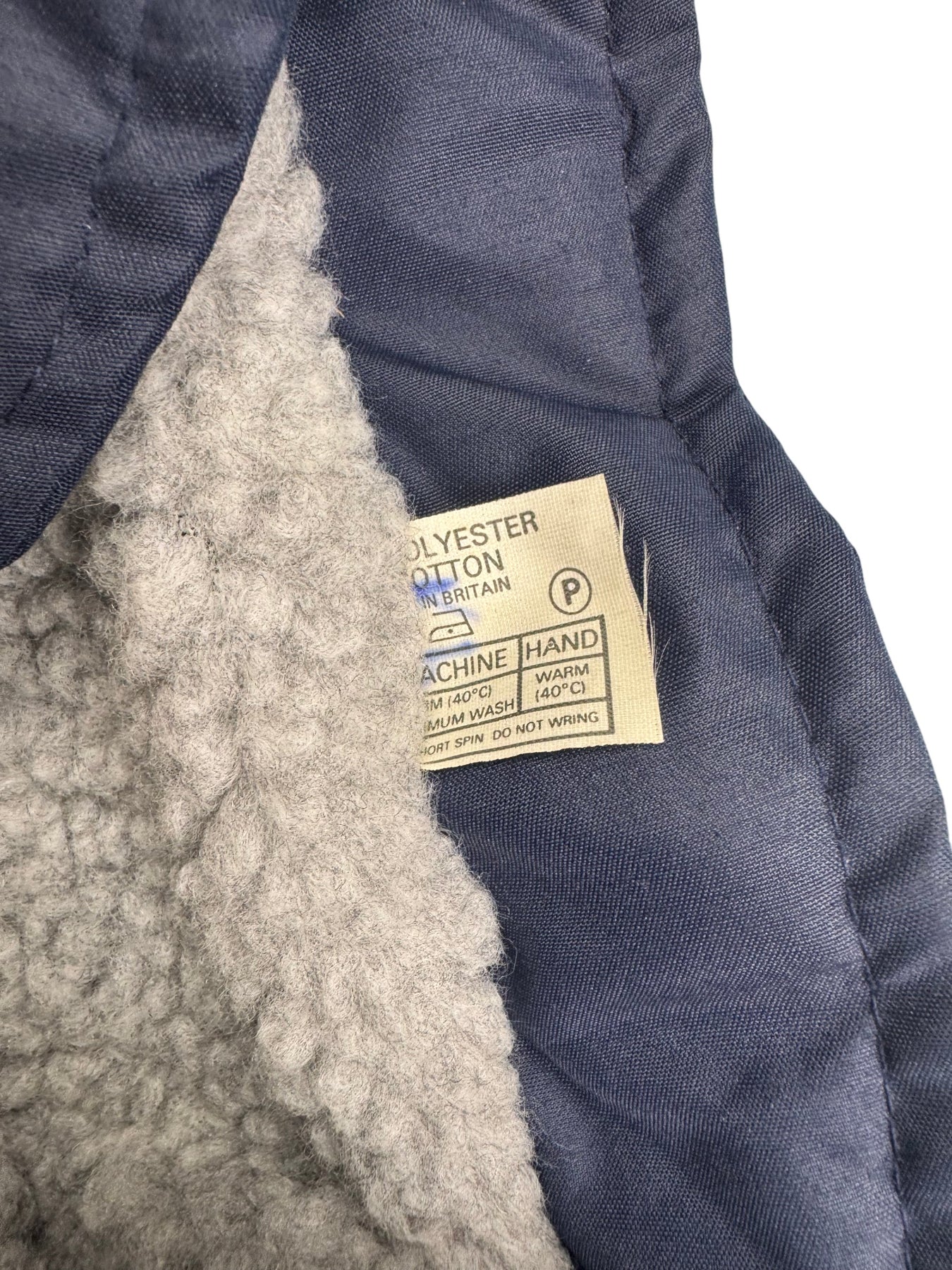 Navy bomber jacket with white piping detail. Features zip closure, front zip pocket, and side pockets. Made from a polyester and cotton blend with a cosy fleece lining. Made in Britain.