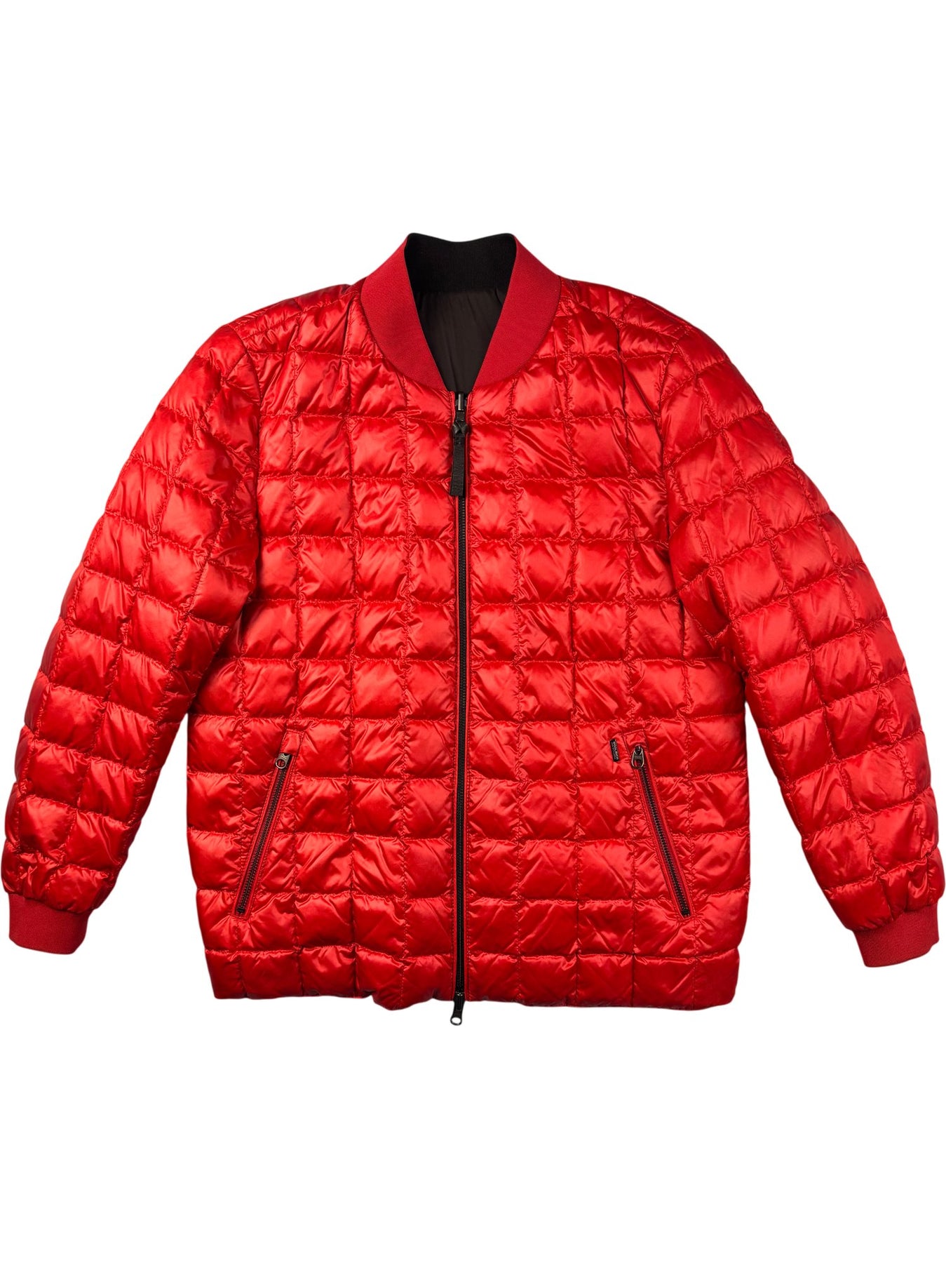 This red puffer jacket features a quilted design with a front zipper closure. It includes two front zip pockets and ribbed cuffs and hem for added style. Made by Woolrich, known for quality outerwear.