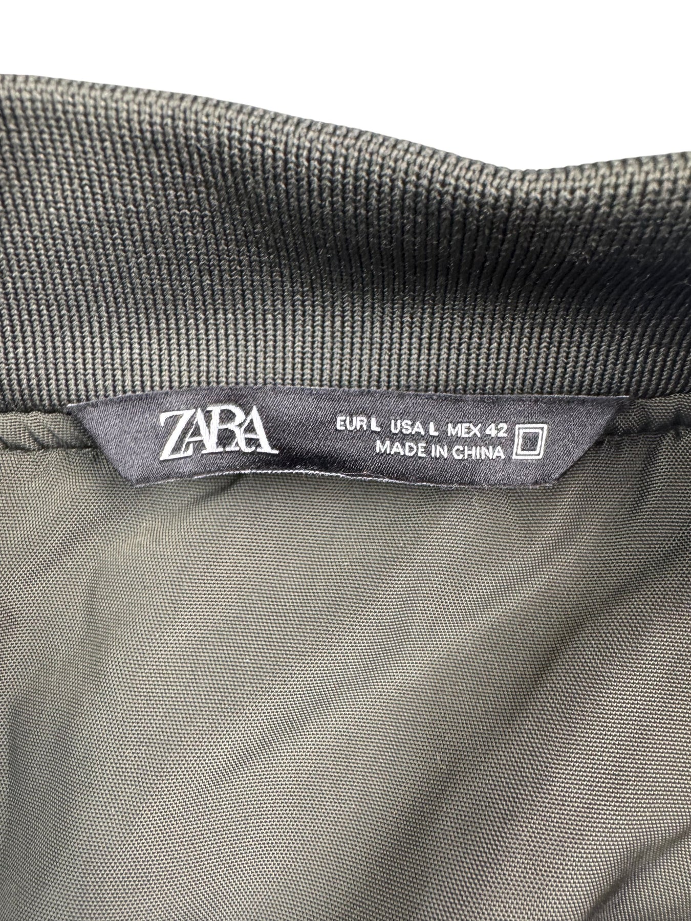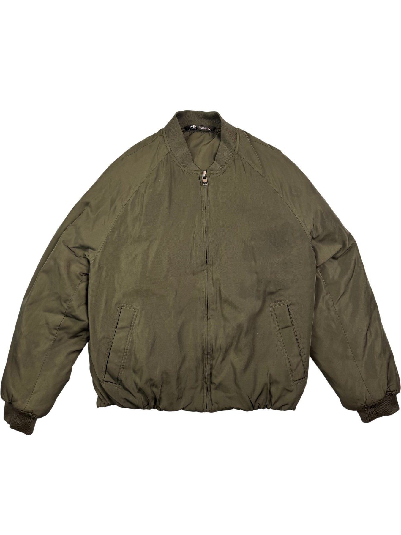 Bomber jacket in olive green with a front zip closure and two front pockets. Features ribbed cuffs and collar for added comfort.