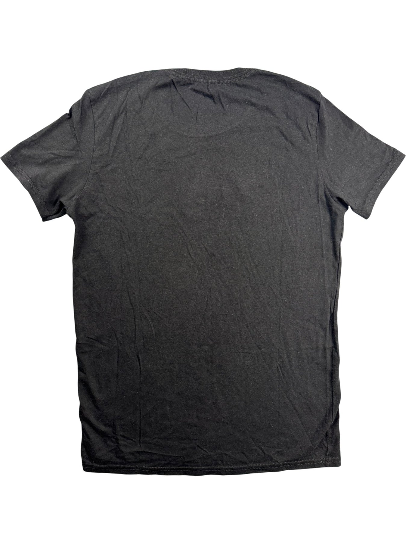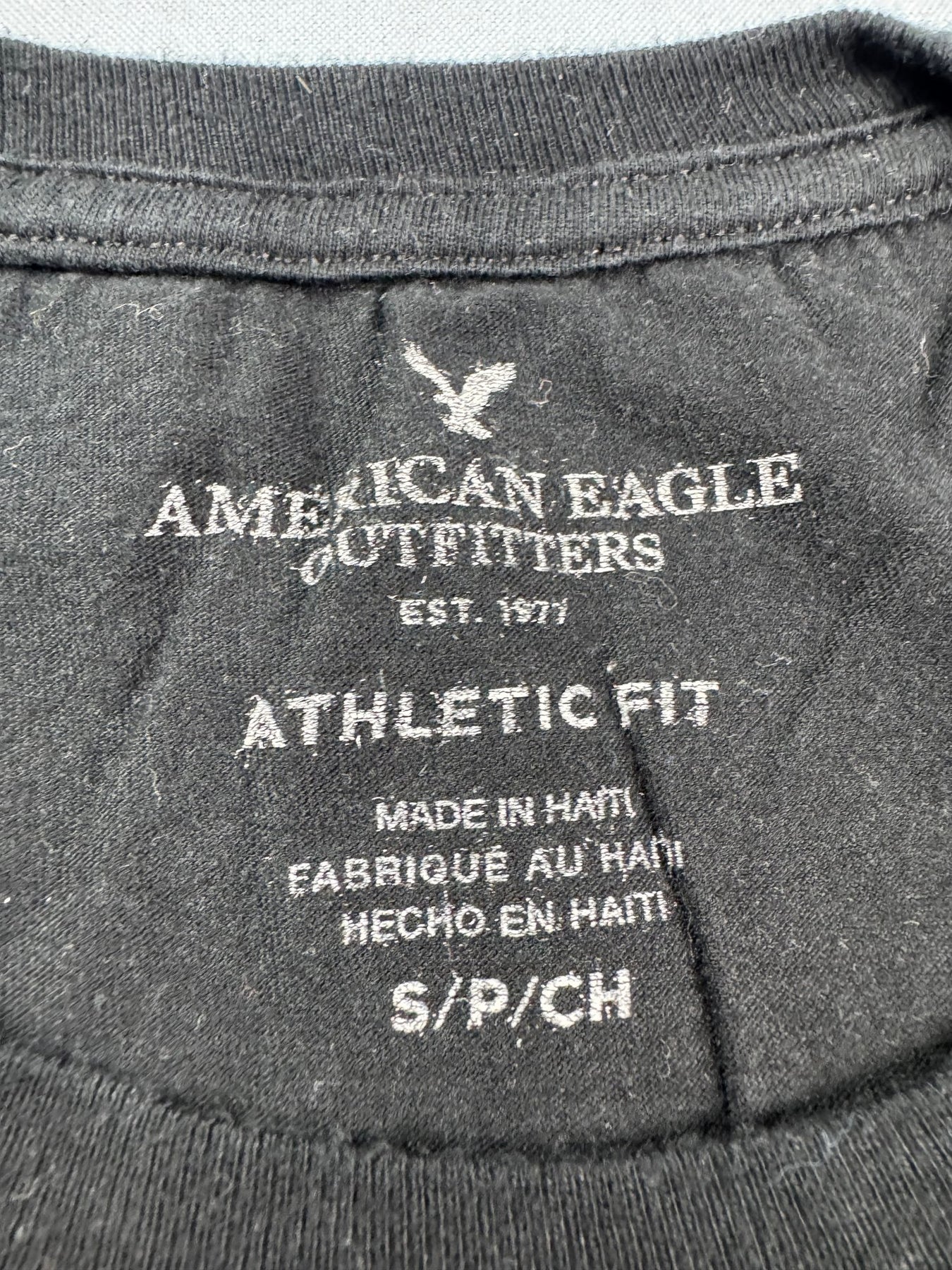 Black T-shirt by American Eagle featuring a gold eagle graphic on the front. Made from 100% cotton for comfort with an athletic fit. Made in Haiti.