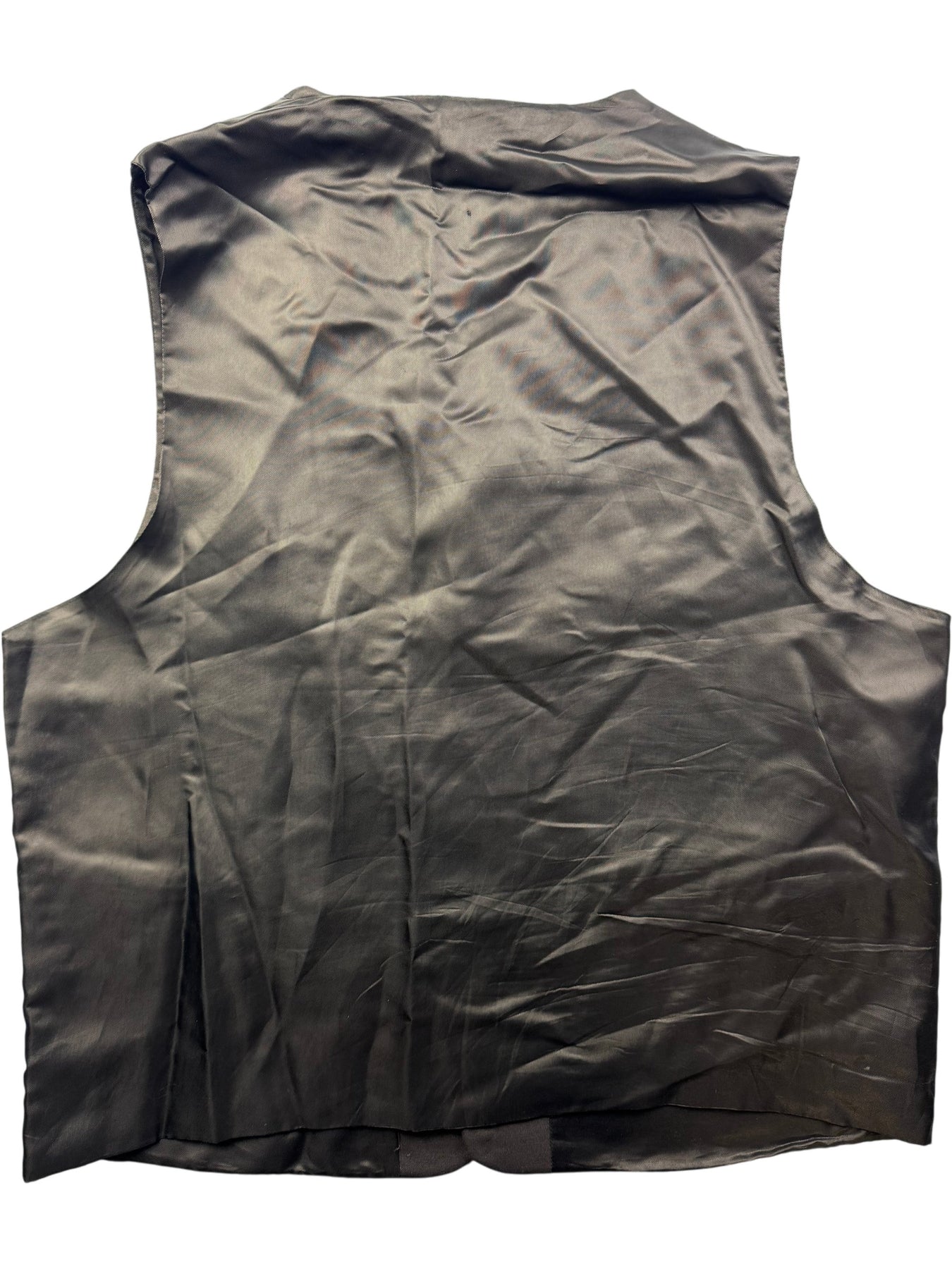 Black vest with a silky lining and five-button front closure. Features two welt pockets at the front. Style offers a formal look suitable for various occasions.