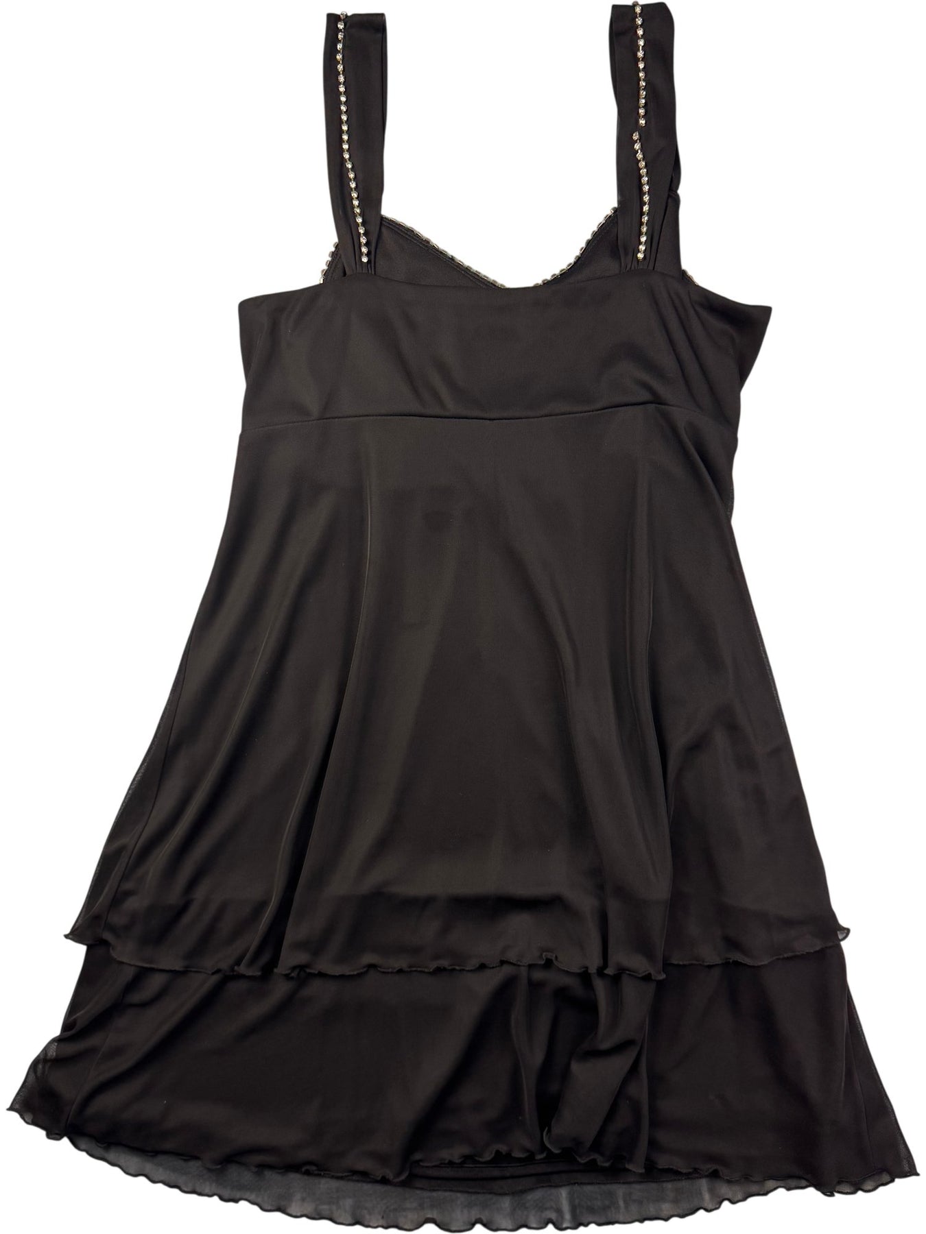 Black dress by Lilly & Rose featuring decorative embellishments along the straps and neckline. Includes three-dimensional floral detailing at the waist and a layered hem. Sleeveless with wide straps for a comfortable fit.
