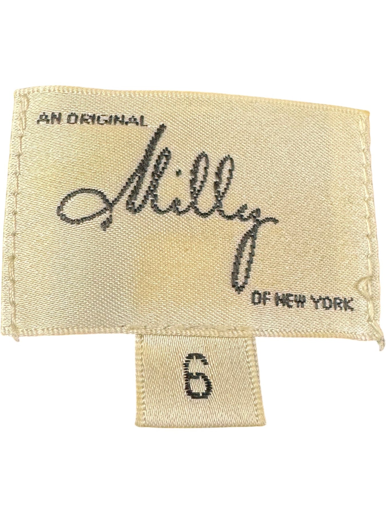 This dress is made from 100% silk with a striking circle pattern. It features a deep V-neck and three-quarter sleeves.