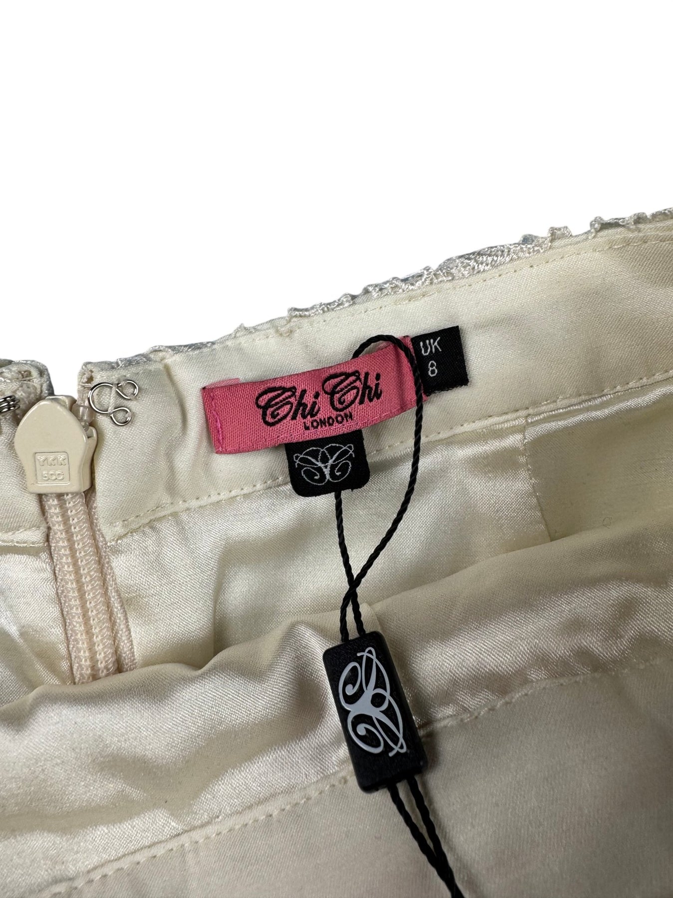 Elegant pencil skirt featuring intricate lace overlay. Designed by Chi Chi London. Includes a back zip closure and fully lined interior.