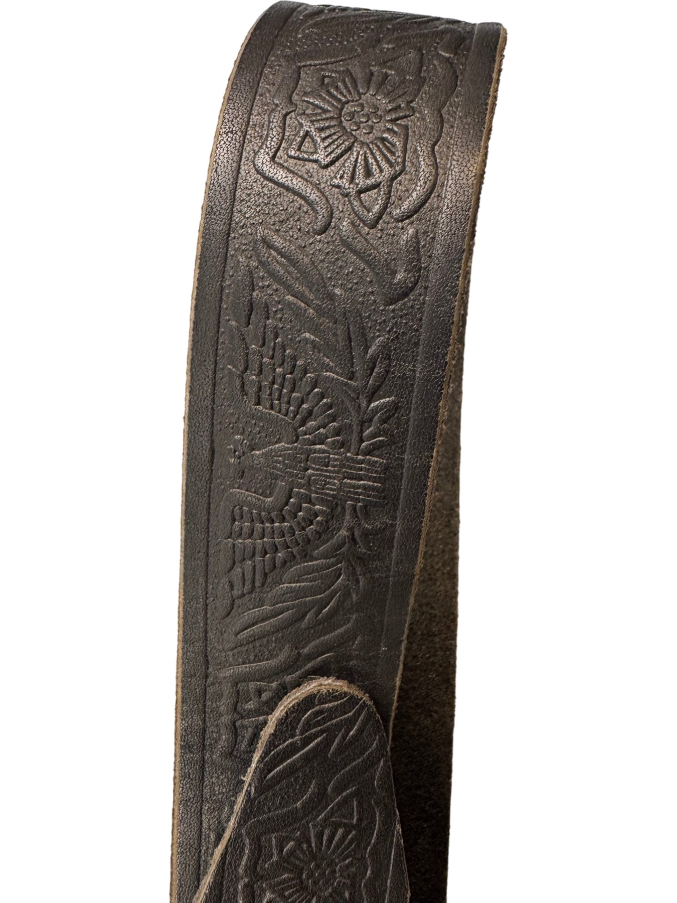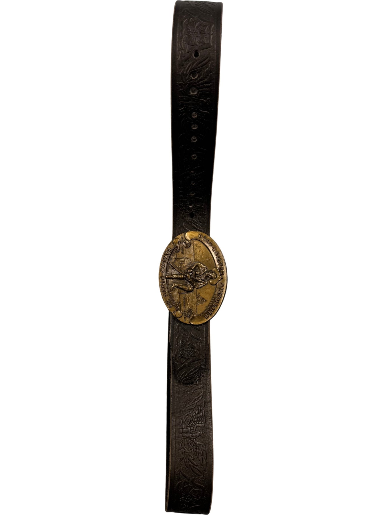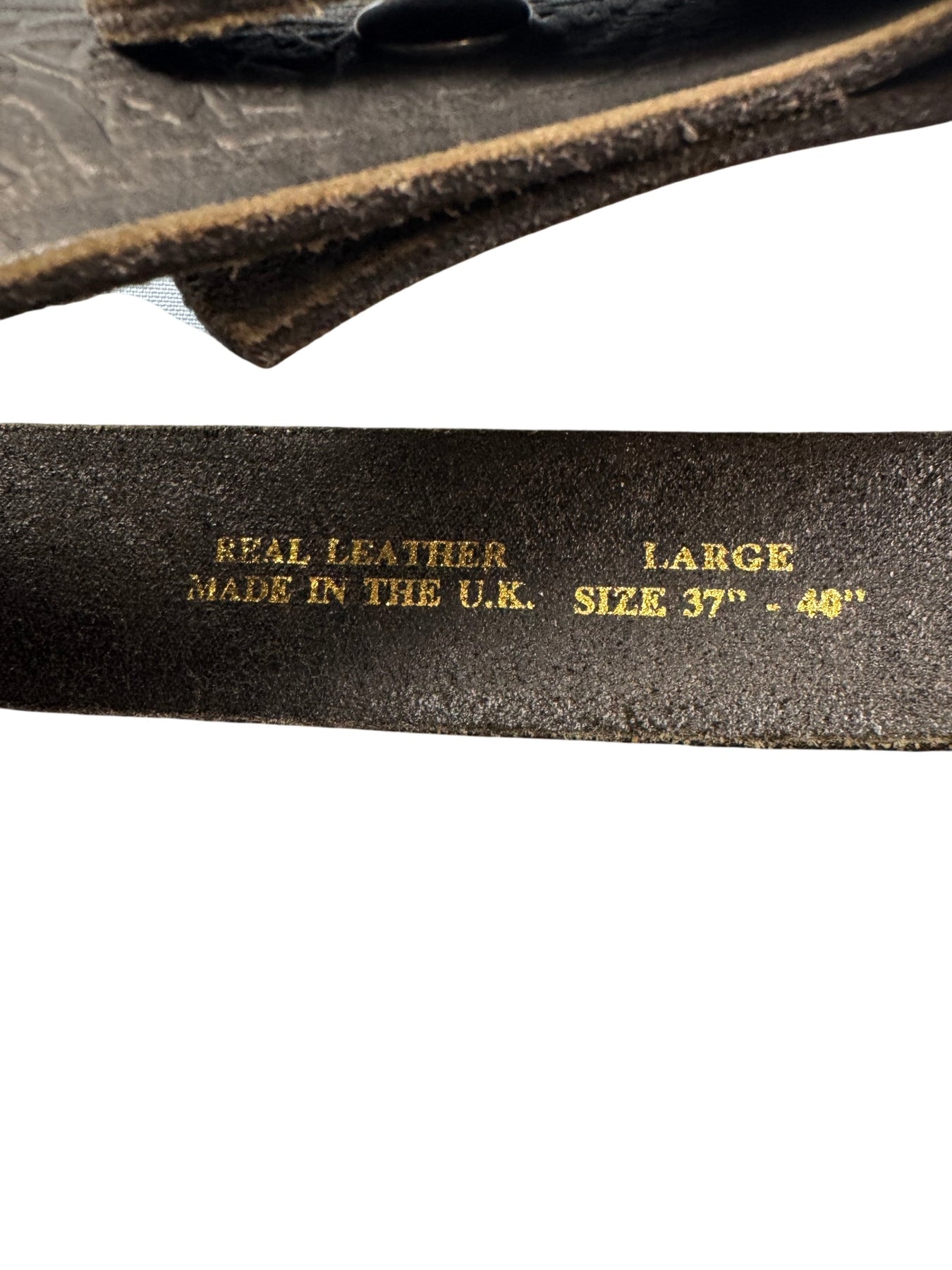 Distinctive gold-tone belt buckle featuring a detailed engraving of a historical figure and ship. The leather belt is decorated with embossed floral patterns and is made in the U.K. The belt size is Large, accommodating waist sizes 37 to 48 inches.