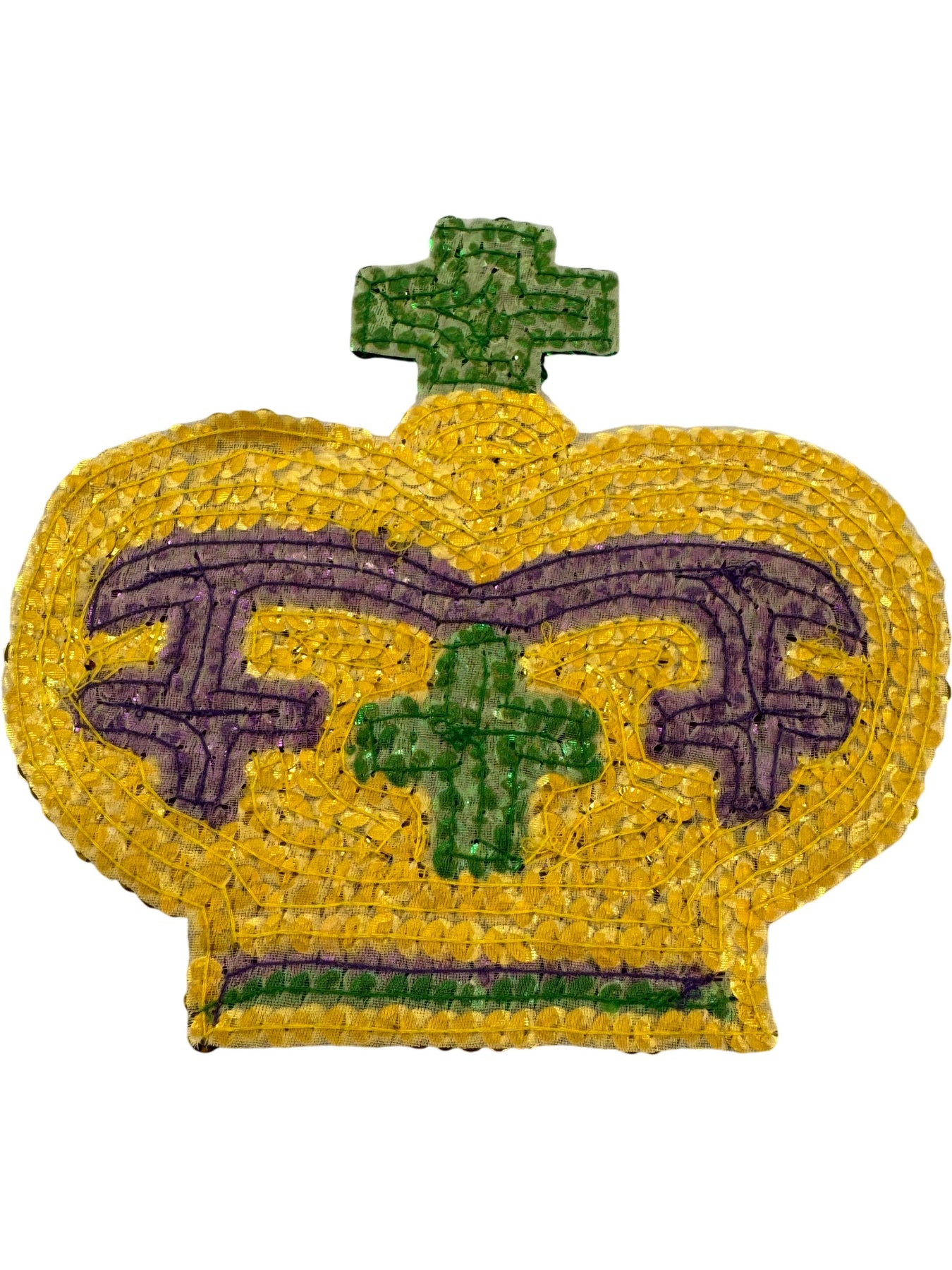 Crown shaped patch featuring vibrant sequins in gold, green, and purple. Ideal for embellishing clothing or accessories. Made with quality sequin material for a striking effect.