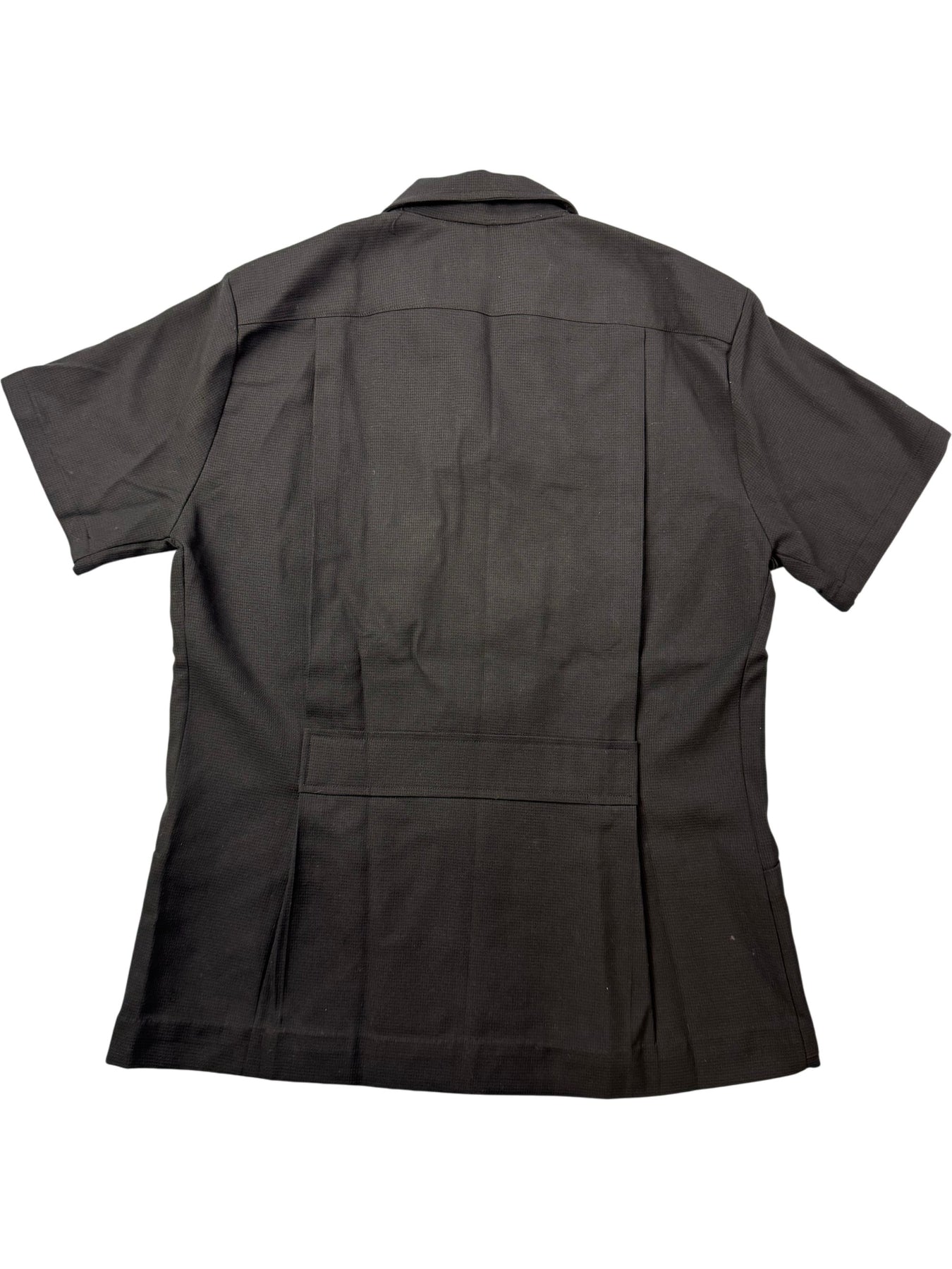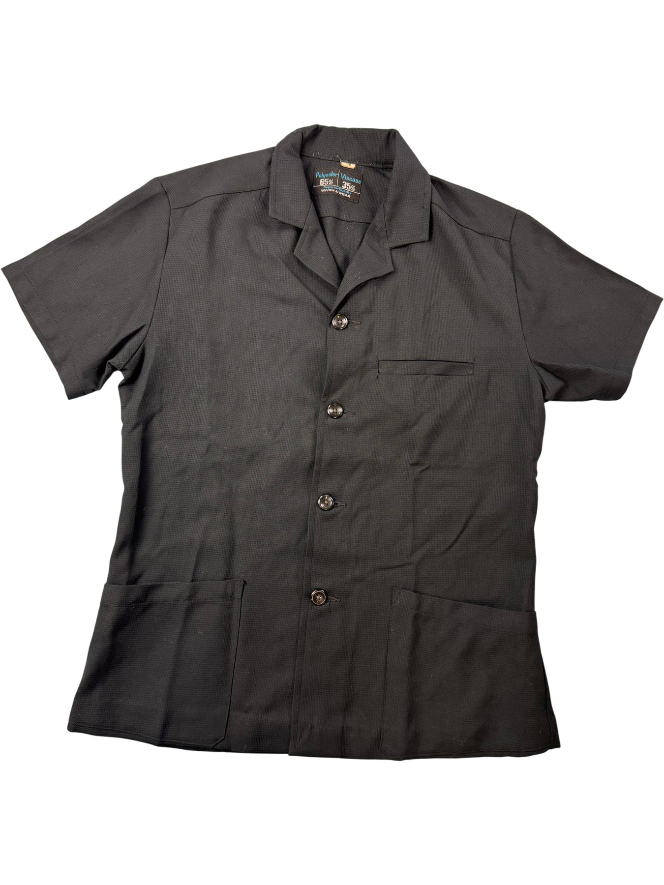 This shirt features a polyester and viscose blend fabric for comfort and durability. It is designed with short sleeves, a button-up front, and a structured collar. There are three front pockets for practicality.