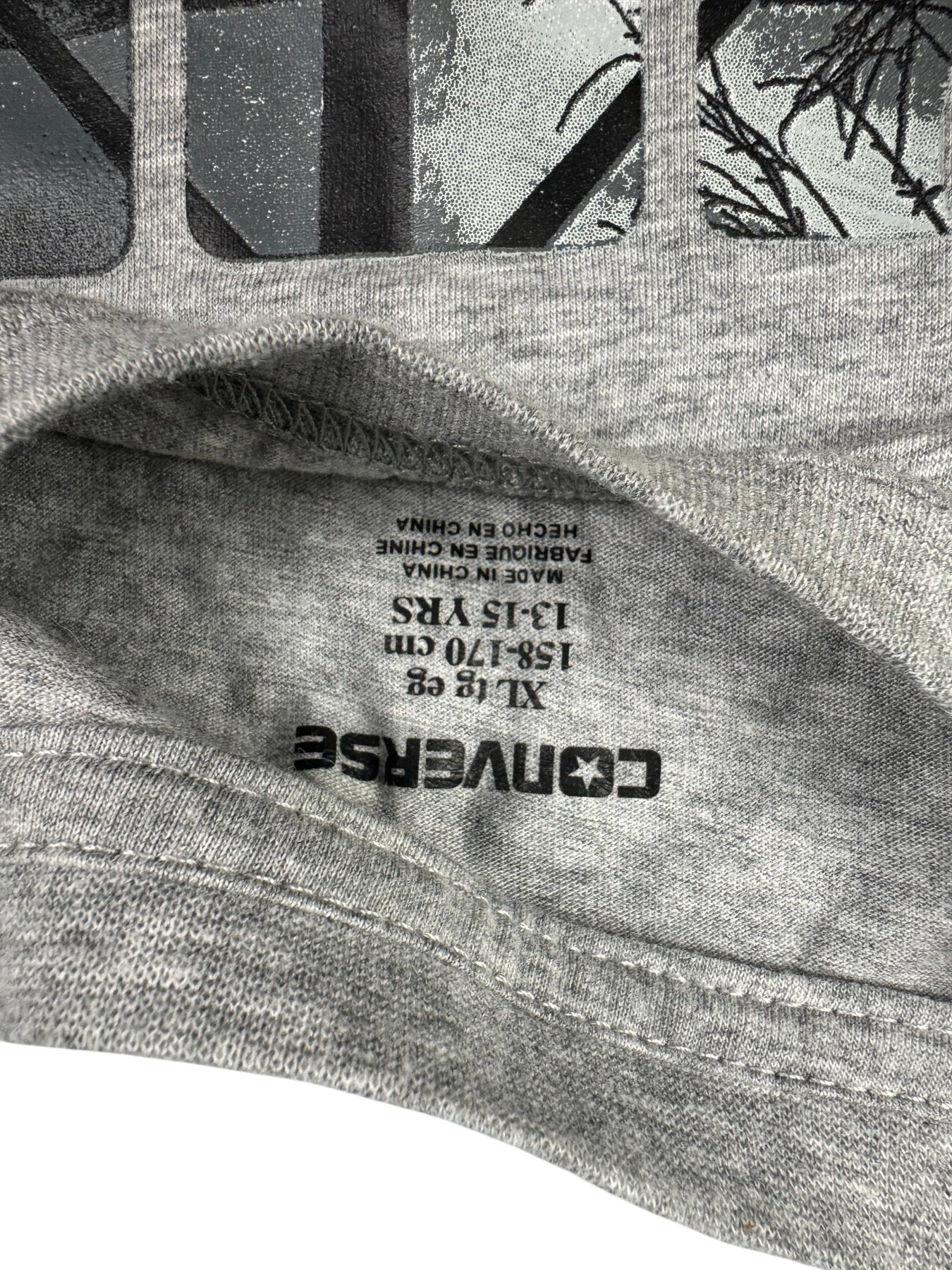 Grey T-shirt with a graphic print on the front. Made of 60% cotton and 40% polyester. Features a round neckline and short sleeves. Suitable for ages 13-15 years.