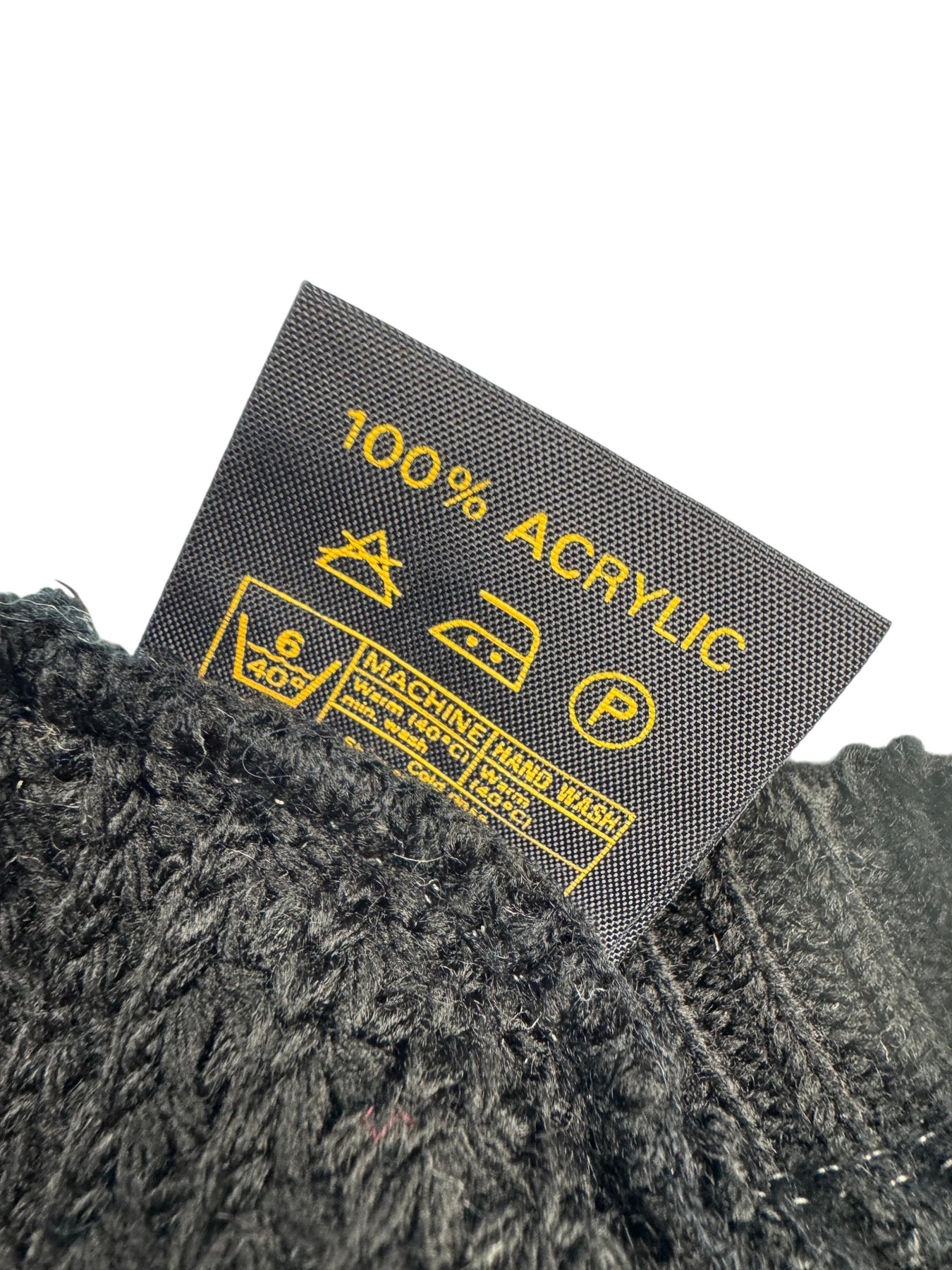 Black V-neck sweater made from 100% acrylic. Features ribbed cuffs and hem with two white stripes on each sleeve. Made in England. Size Small.