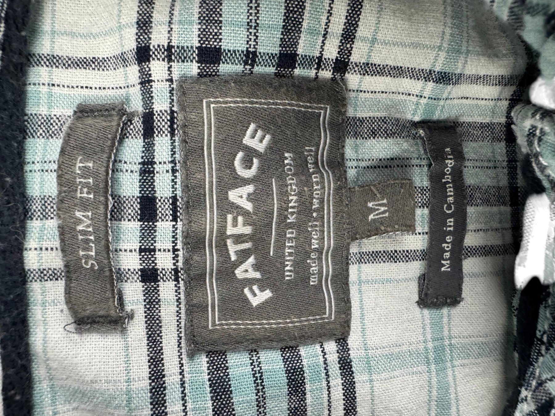 This shirt features a classic checkered pattern with short sleeves and a slim fit design. It has a button-up front and is made by FatFace, a UK-based brand. The label indicates it is made in Cambodia and is a size Medium.
