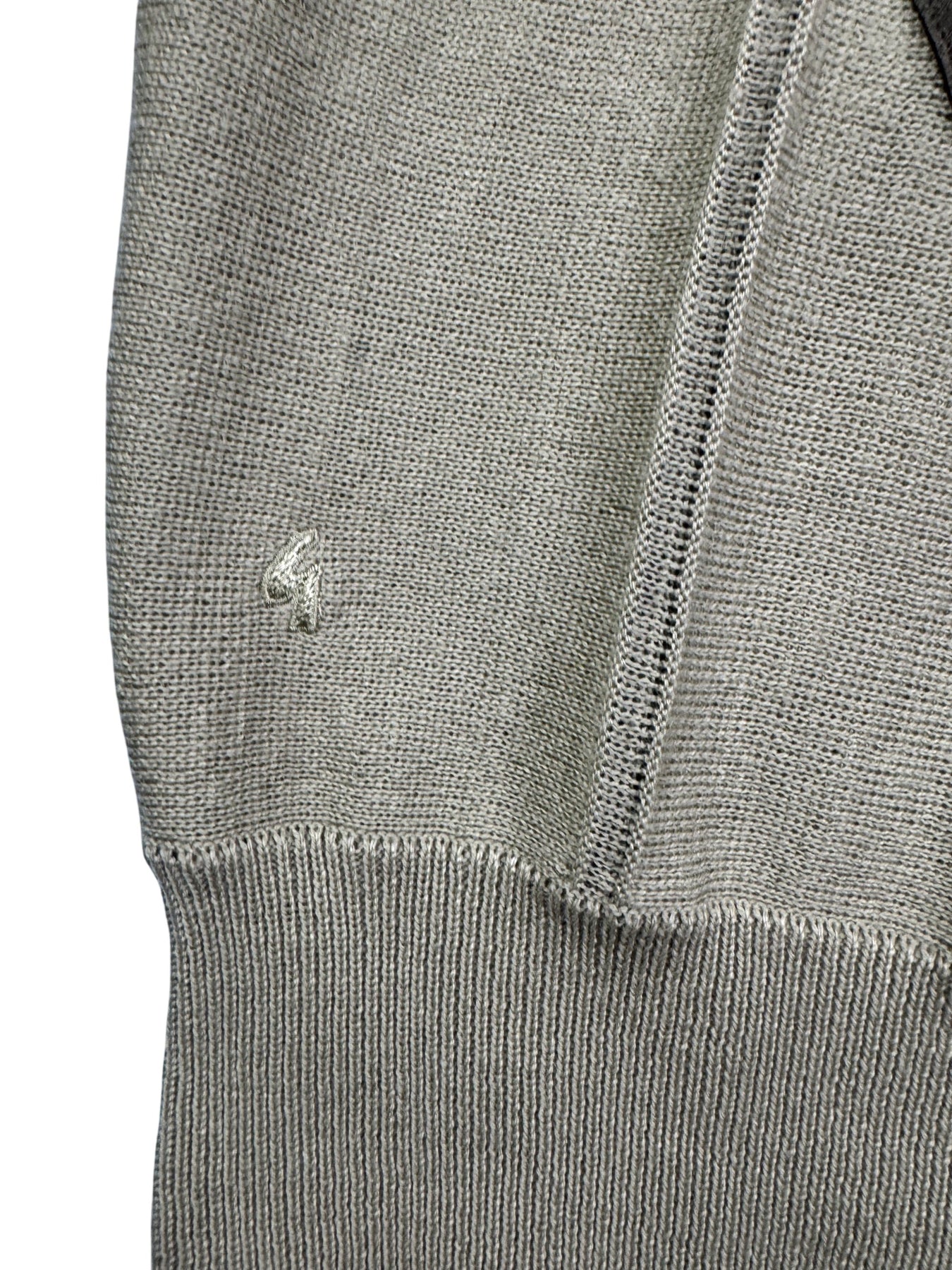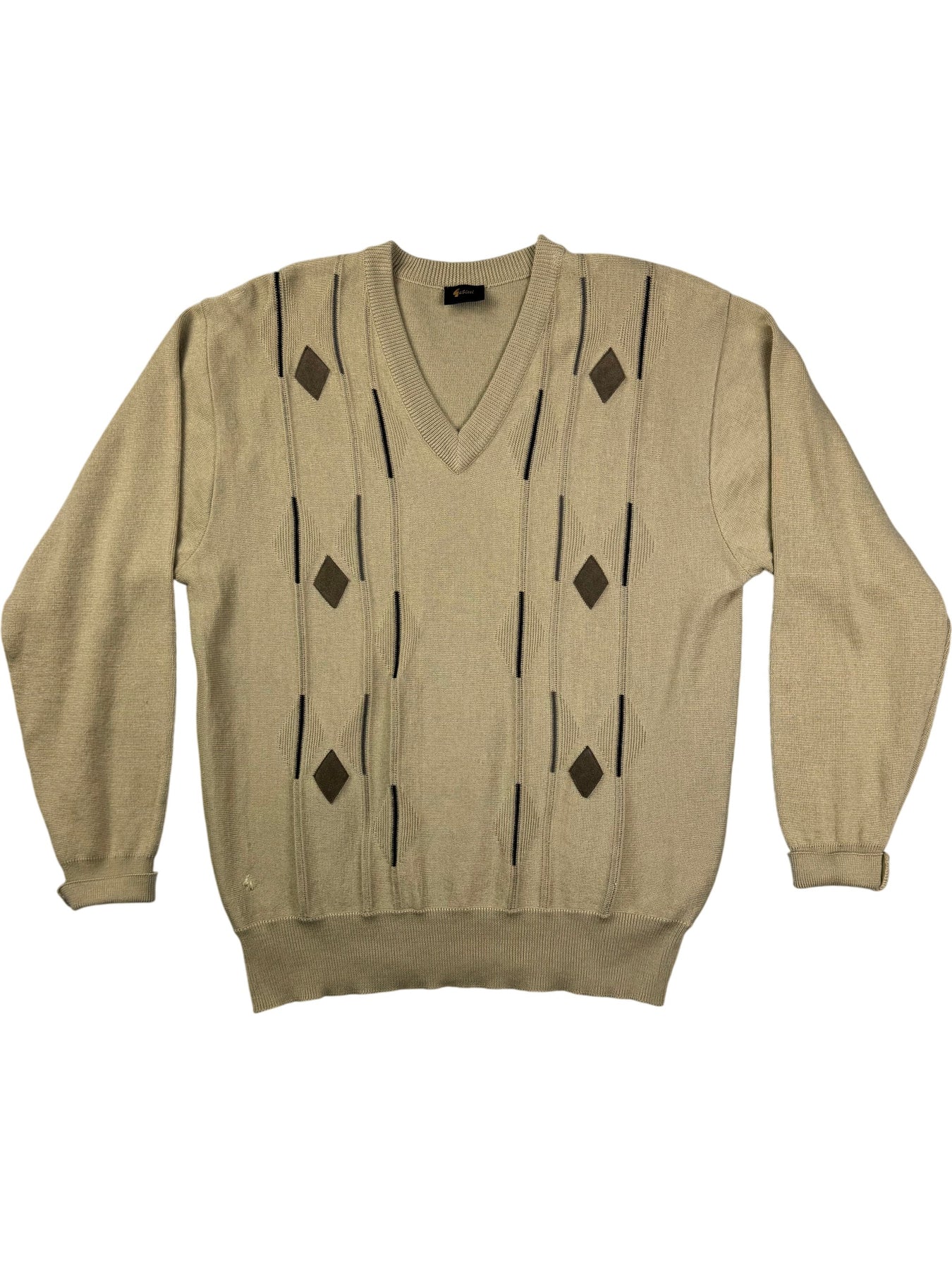 Beige acrylic and wool blend sweater with V-neck design. Features geometric pattern with ribbed cuffs and hem. Made by Gabicci.