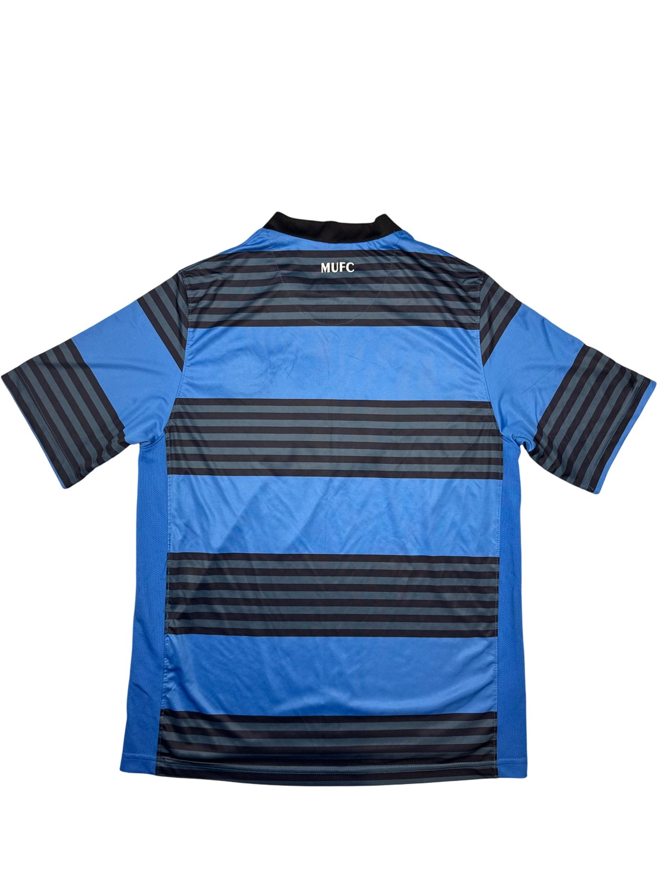 Nike Dri-FIT technology for optimal moisture control. Striking blue and black horizontal stripes with Manchester United crest and sponsor logo on front. Made in Sri Lanka.