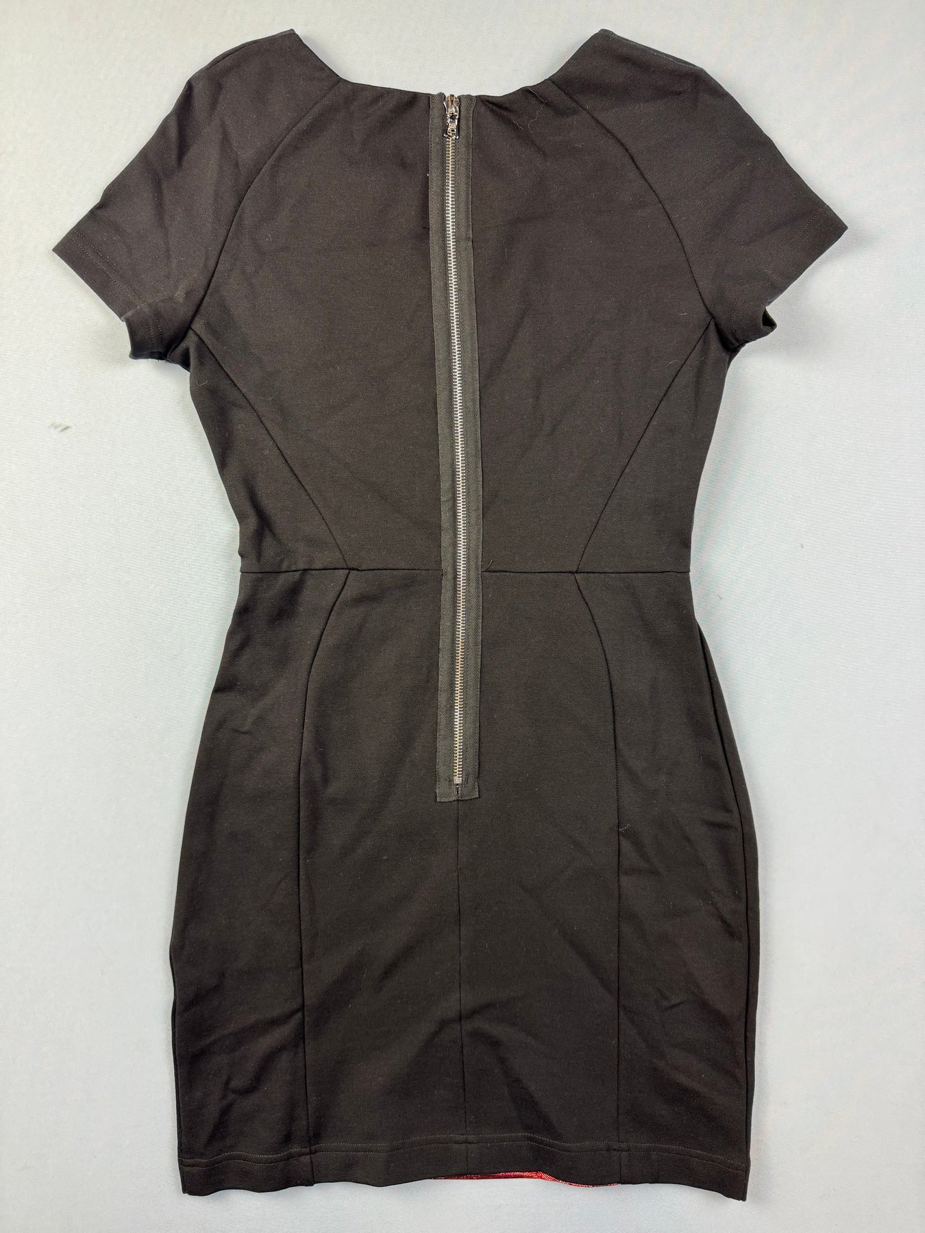 Short sleeve dress featuring a vibrant red and black colour scheme with contrasting panels. Made by Markus Lupfer, with a back zipper closure and a fitted silhouette. The dress requires dry cleaning only.