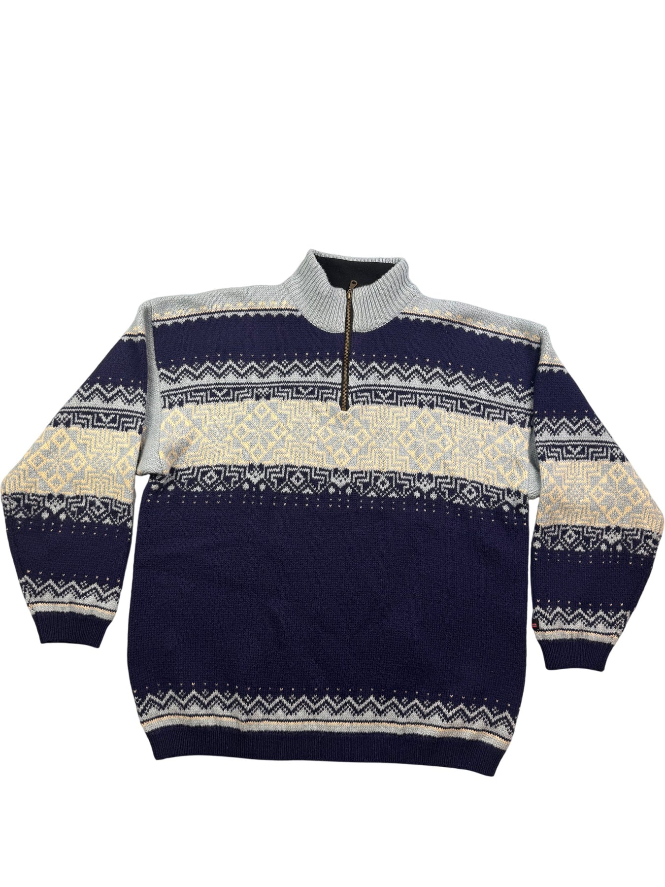 Norwool sweater with traditional Norwegian pattern in blue and white. Made from 100% pure wool, featuring a quarter zip and a high collar for added warmth.