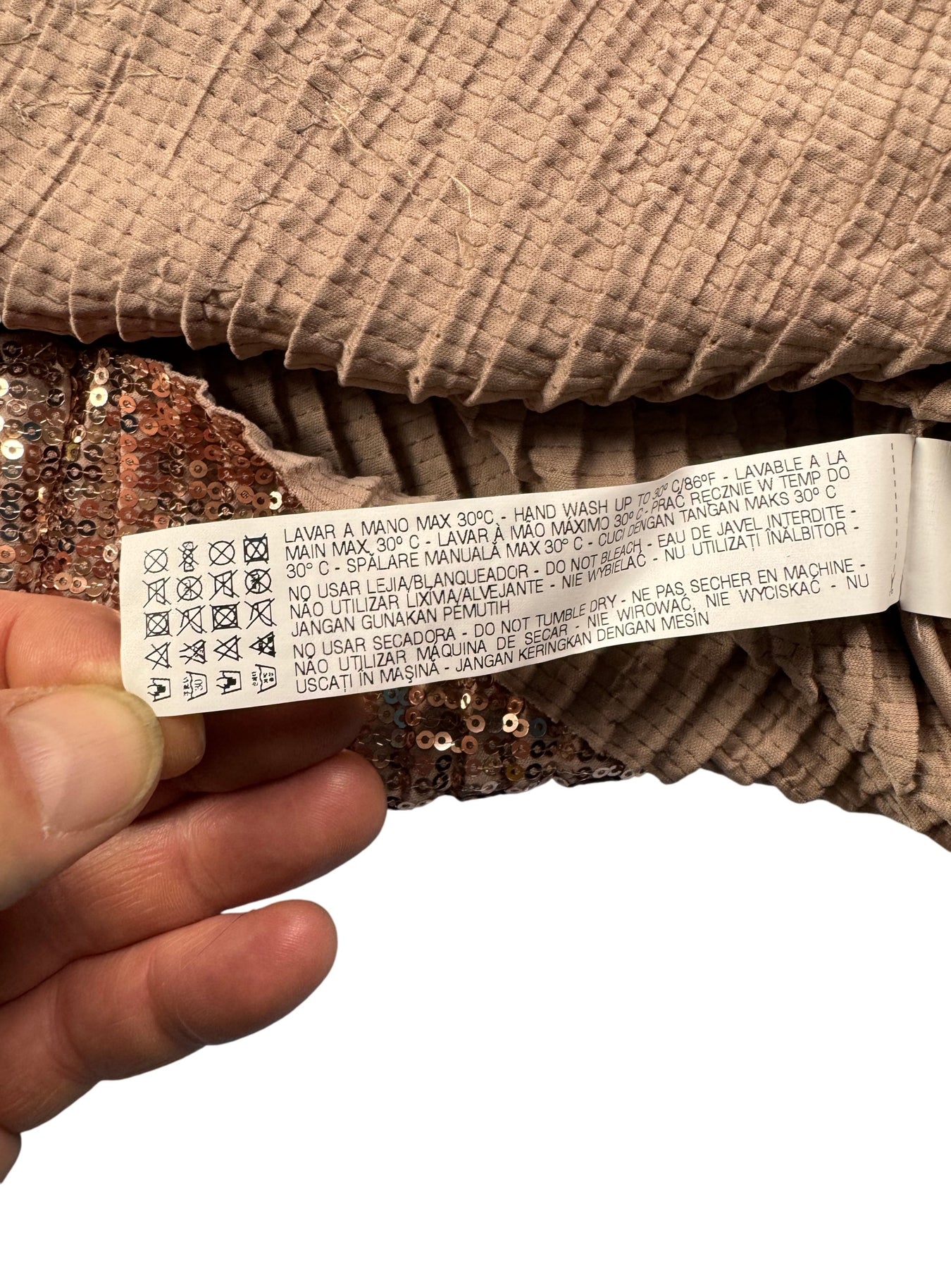 This Zara dress features a stunning sequin design with a cold shoulder style. It includes spaghetti straps and three-quarter length sleeves, providing a unique and eye-catching look.