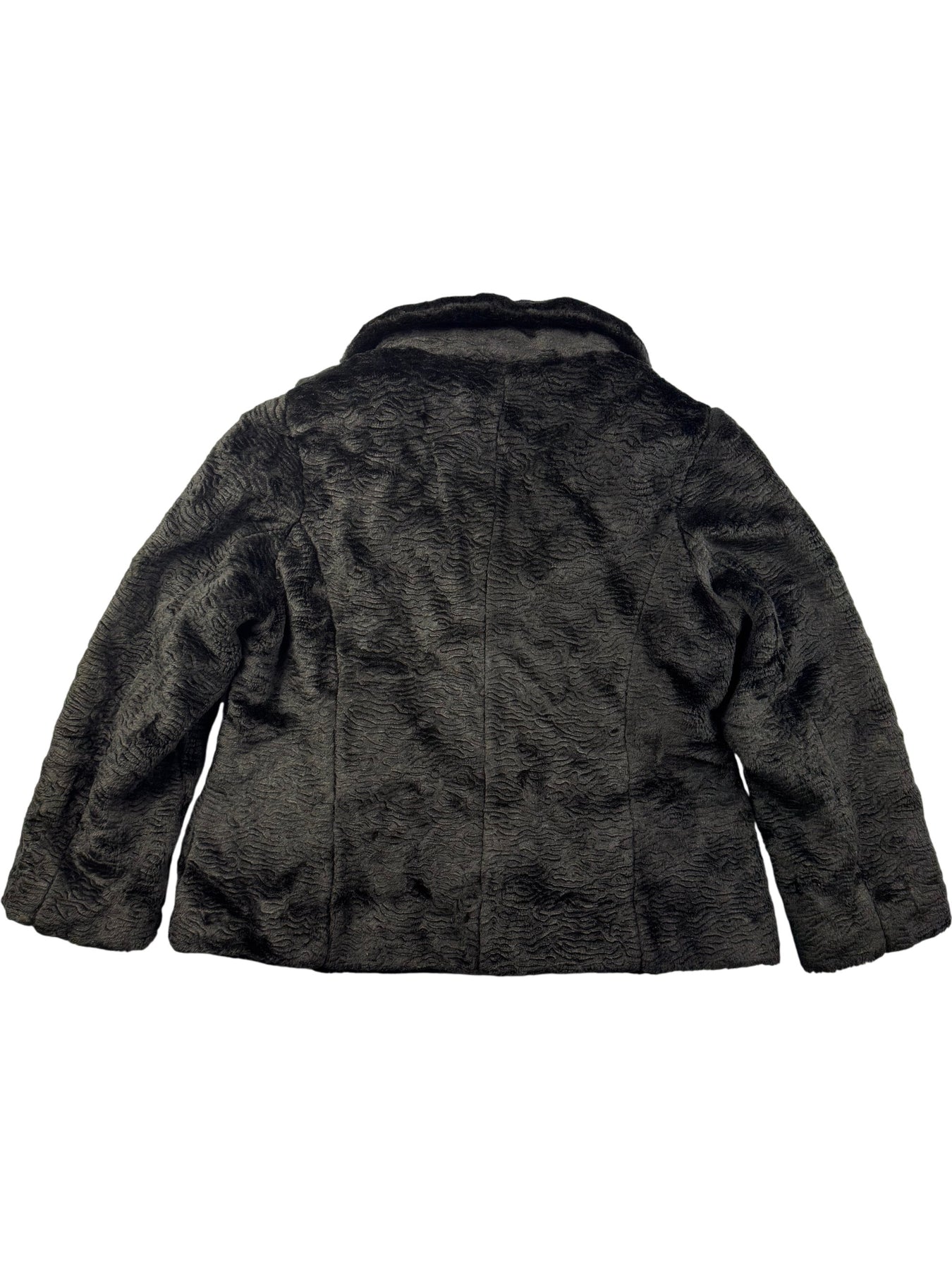 Black faux fur jacket with a classic collar and long sleeves. Made from a blend of 90% acrylic and 10% polyester for the shell, with a 100% polyester lining. Features a comfortable fit and an elegant style.