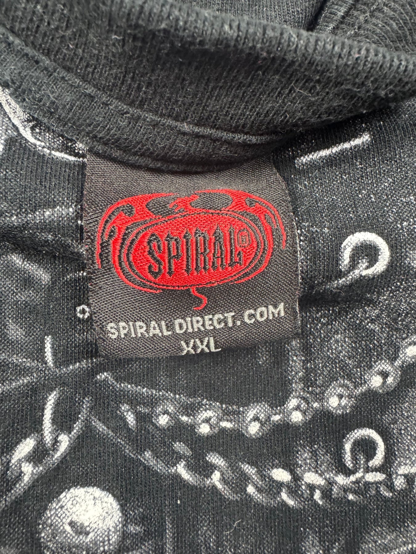 Black long sleeve t-shirt featuring a gothic design with a skull and chains motif on the front and back. Made from 100% cotton with detailed graphic prints. Crew neckline with a Spiral Direct label.