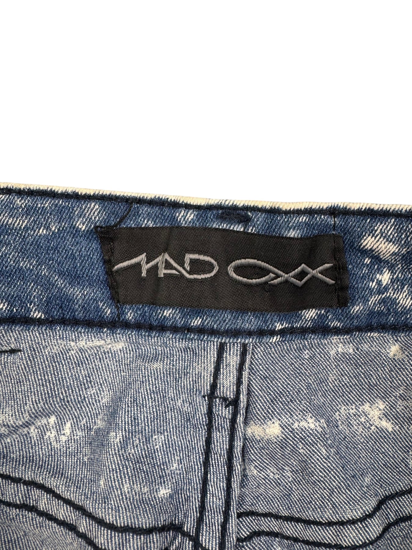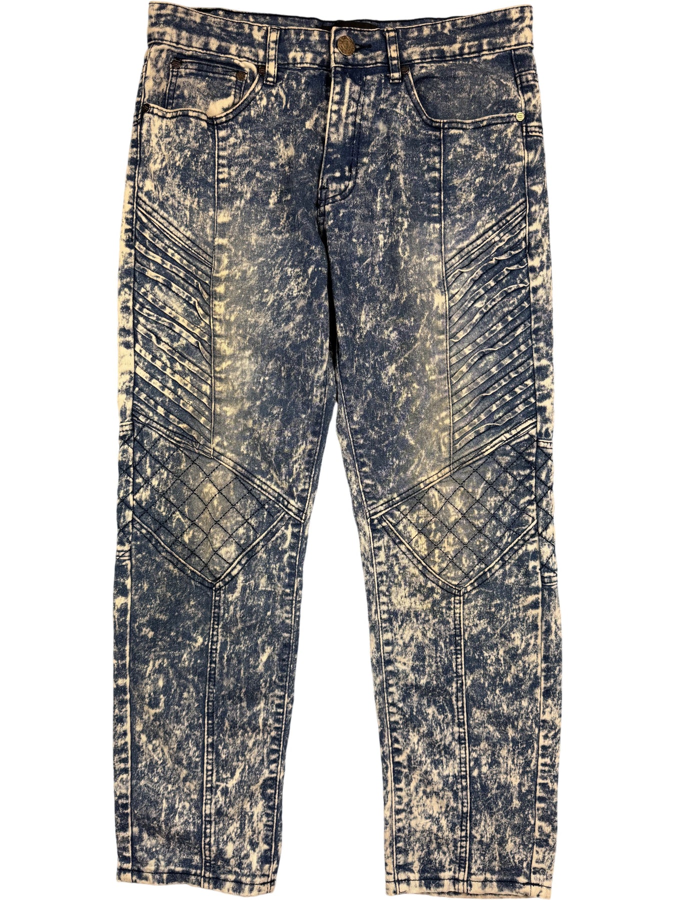 Stone wash jeans with unique pattern detailing. Made from 60% cotton, 29% polyester, 10% viscose, and 1% spandex. Features multiple stitched panels and classic five-pocket design.