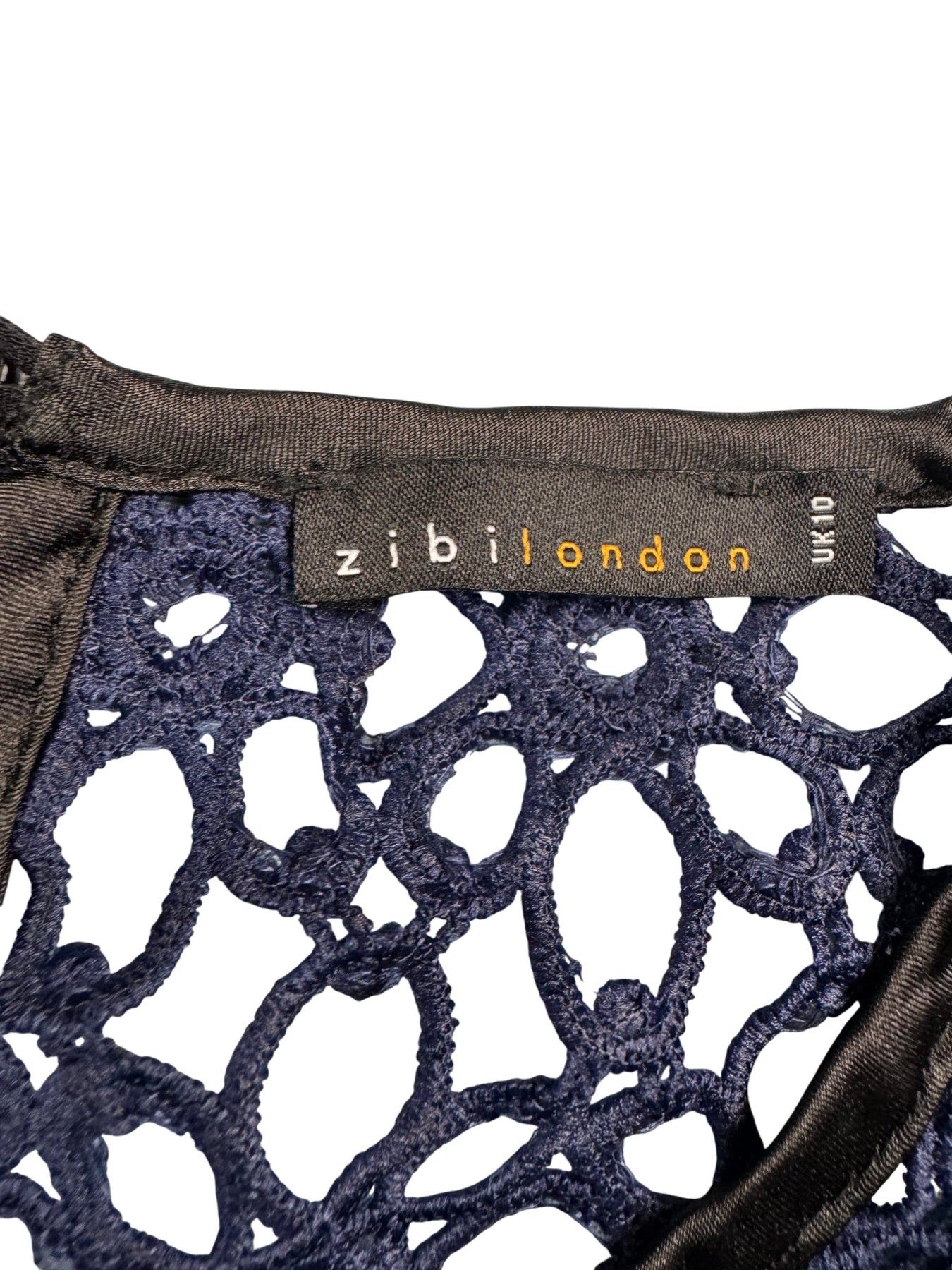 Navy crochet design with short sleeves. Button closure at the back. Made by Zibi London.