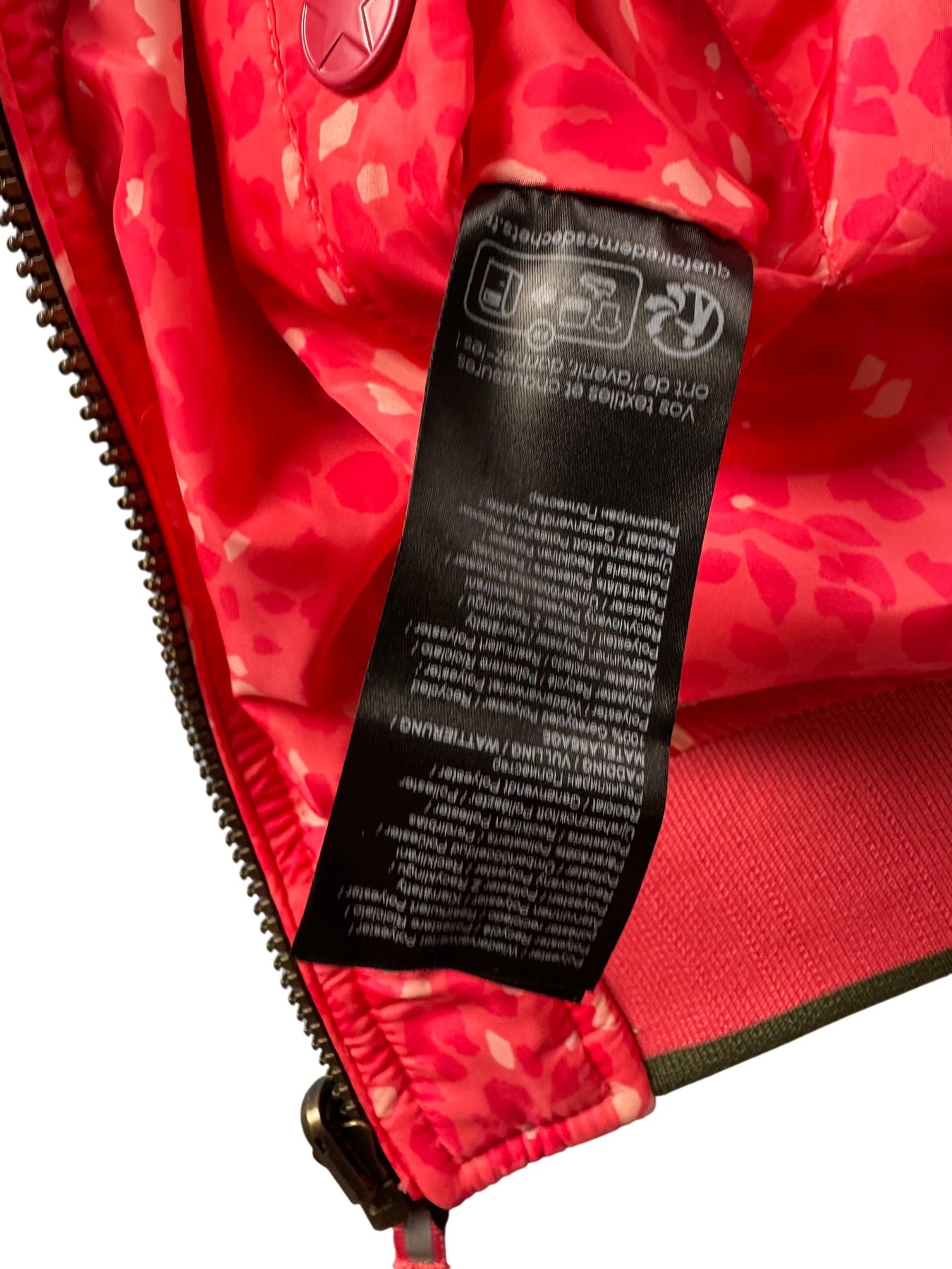 Olive green quilted bomber jacket with ribbed cuffs and hem. Features a 'Summer' patch on the sleeve and a bright red patterned lining. Made from polyester with a zipper front closure.