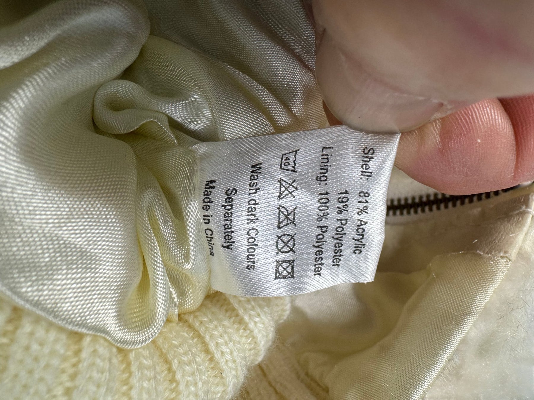 This Jane Norman jumper features a faux fur trim along the neckline and cuffs, adding a stylish touch. It is made from a blend of 81% acrylic and 19% polyester with a 100% polyester lining. The jumper includes a front zipper for easy wear.
