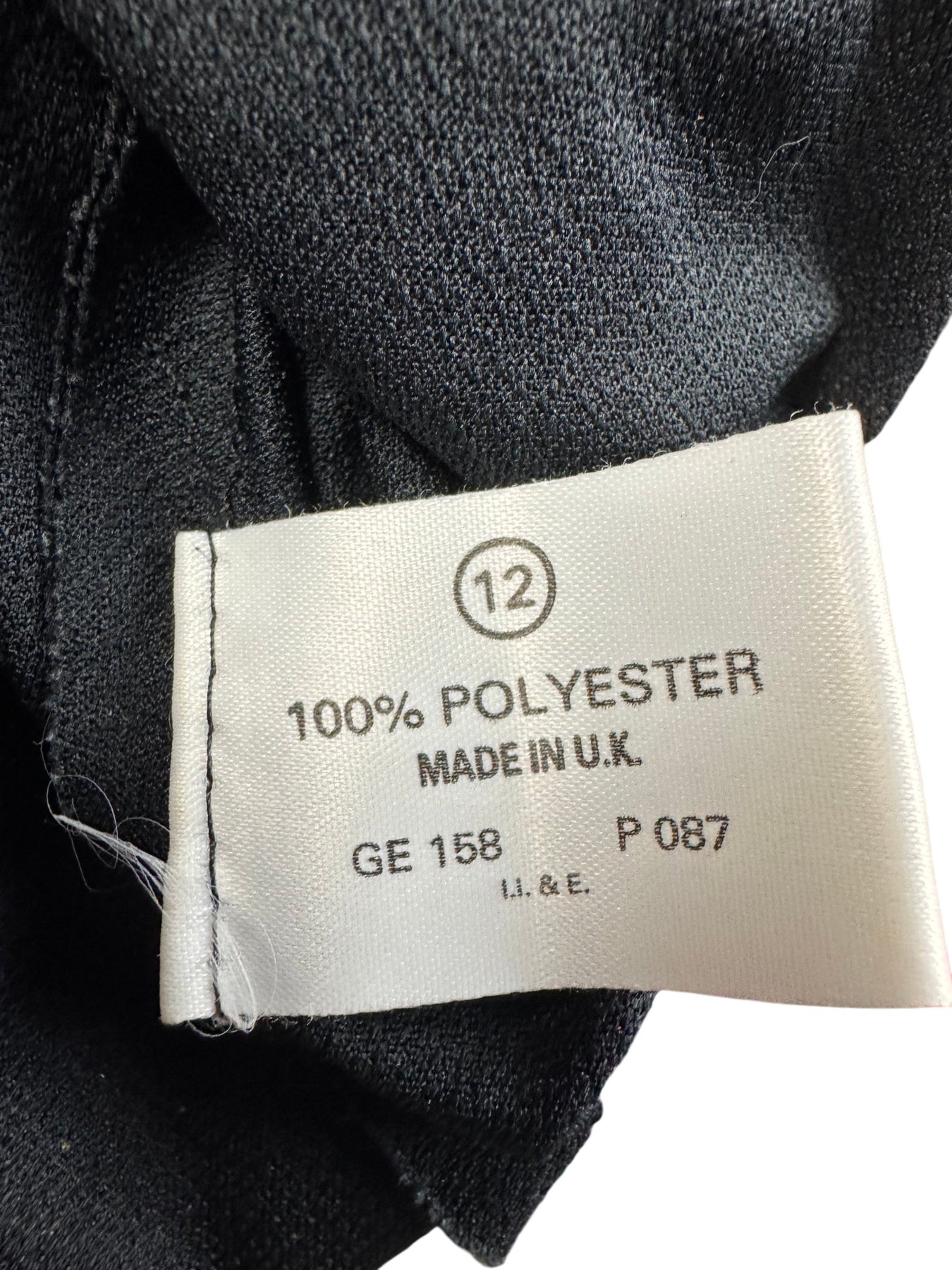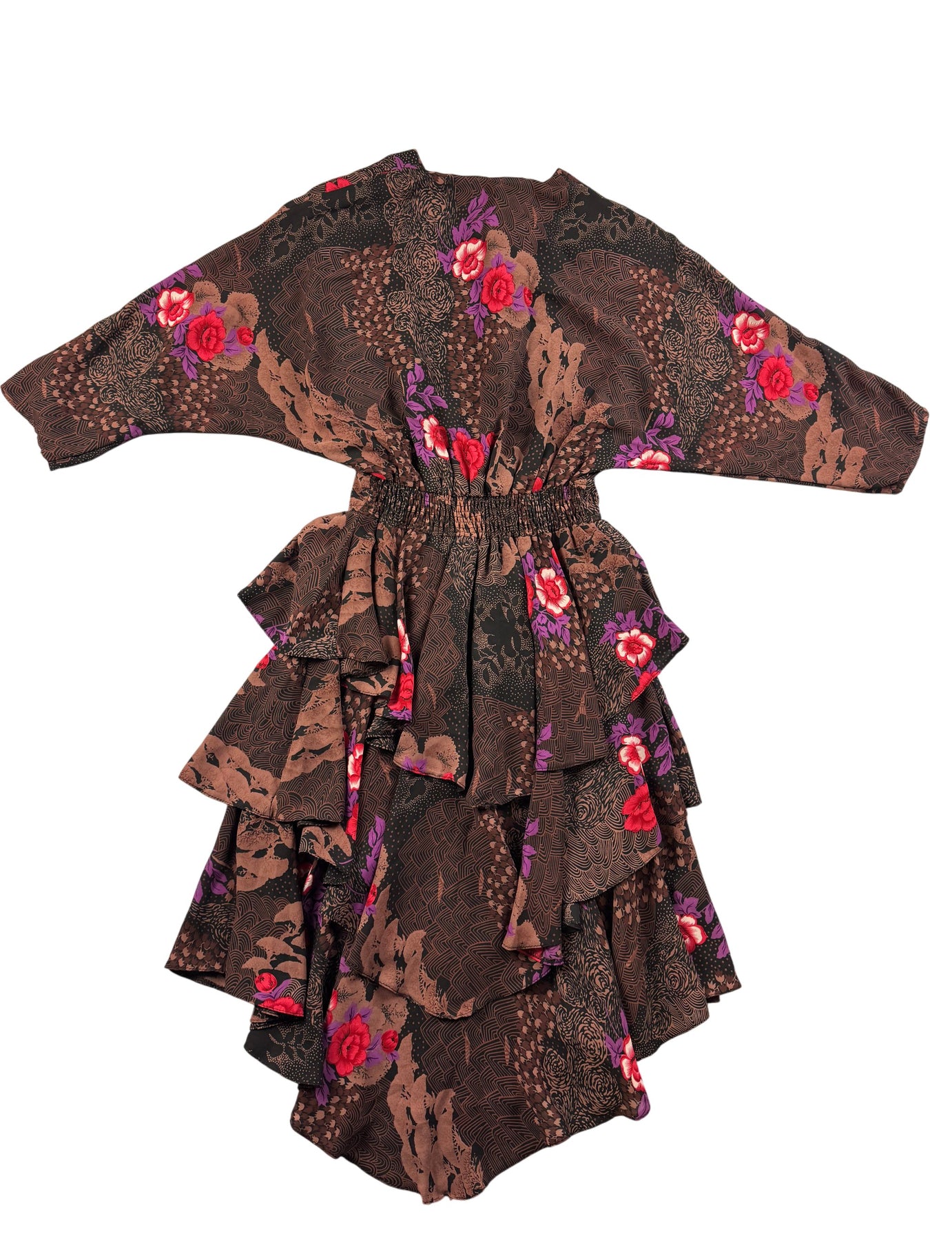 100% polyester fabric. Made in the U.K. Features a floral pattern with vibrant red and purple accents. Includes a unique layered skirt design and long sleeves. Elastic waistband for a comfortable fit.