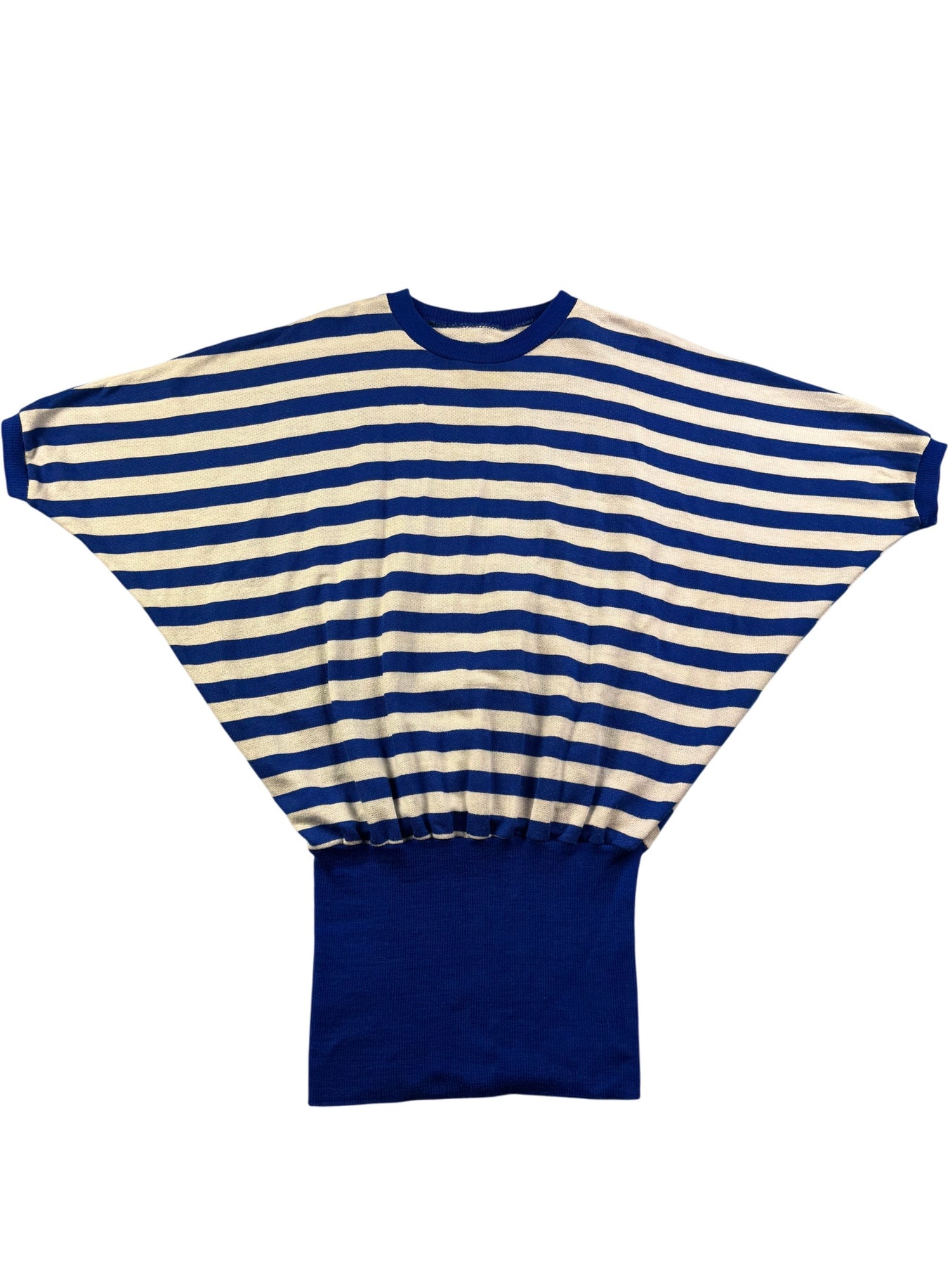 Striped batwing top with wide blue and white horizontal stripes and a fitted waist. Features a round neckline and short sleeves.