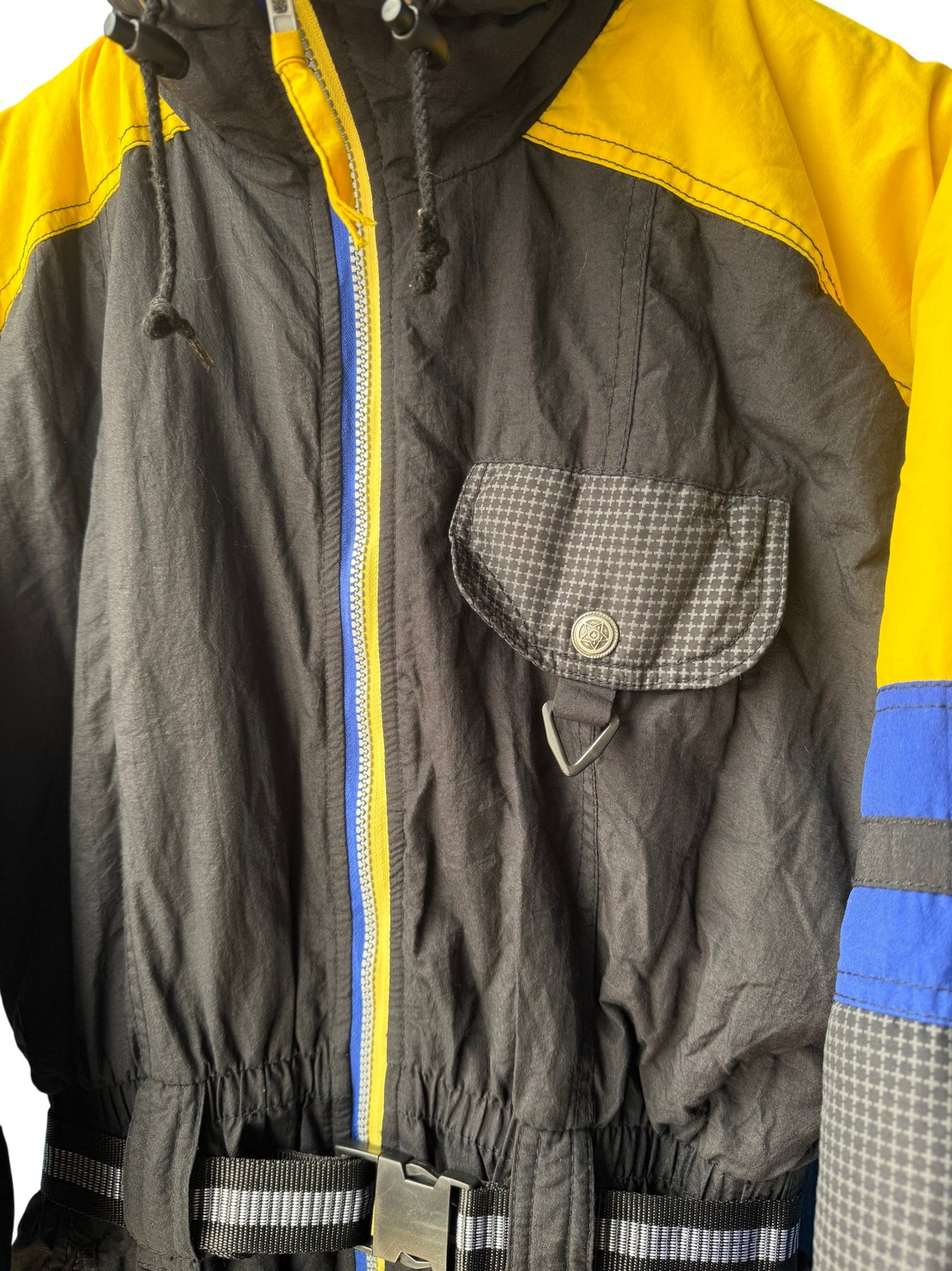 One-piece ski suit with a bold yellow, blue, and black color scheme. Equipped with a front zipper, largely adjustable belt, and a pocket with button closure. Features a hood and elastic cuffs for added protection against the cold.