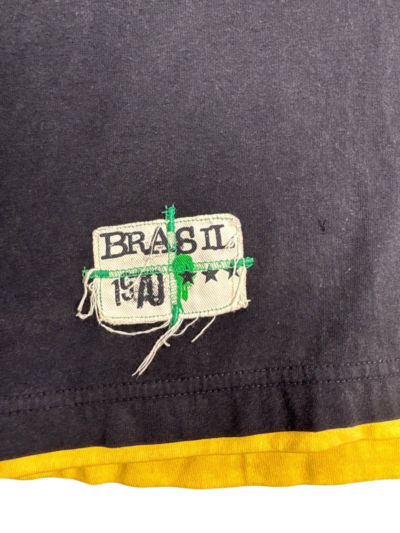Black t-shirt with yellow trim and a prominent 1970 Brasil graphic design featuring the Christ the Redeemer statue. Includes a small patch at the bottom left with similar Brasil branding.