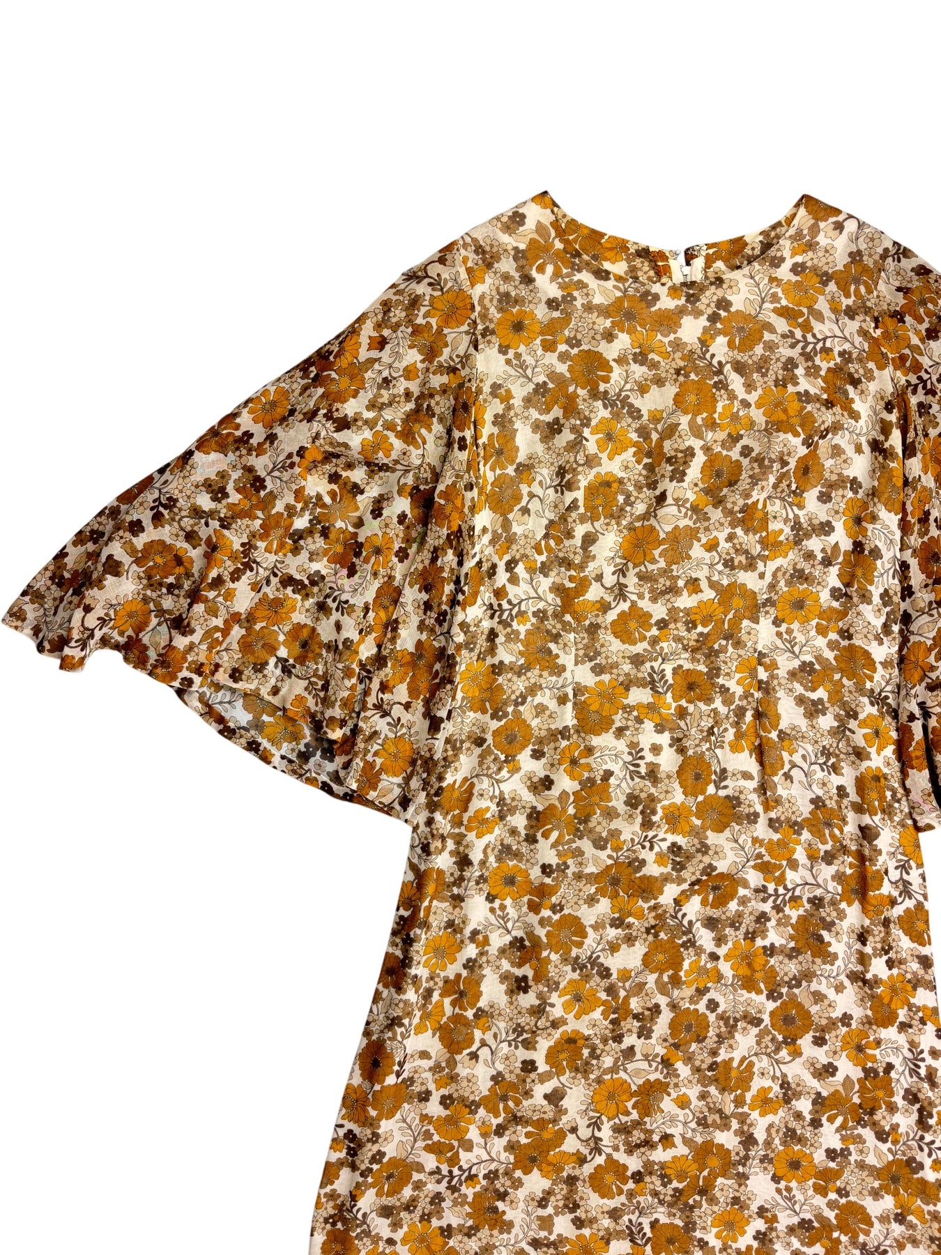 Floral patterned maxi dress with wide sleeves and back zip closure. Features mustard and brown flower designs on a beige background.