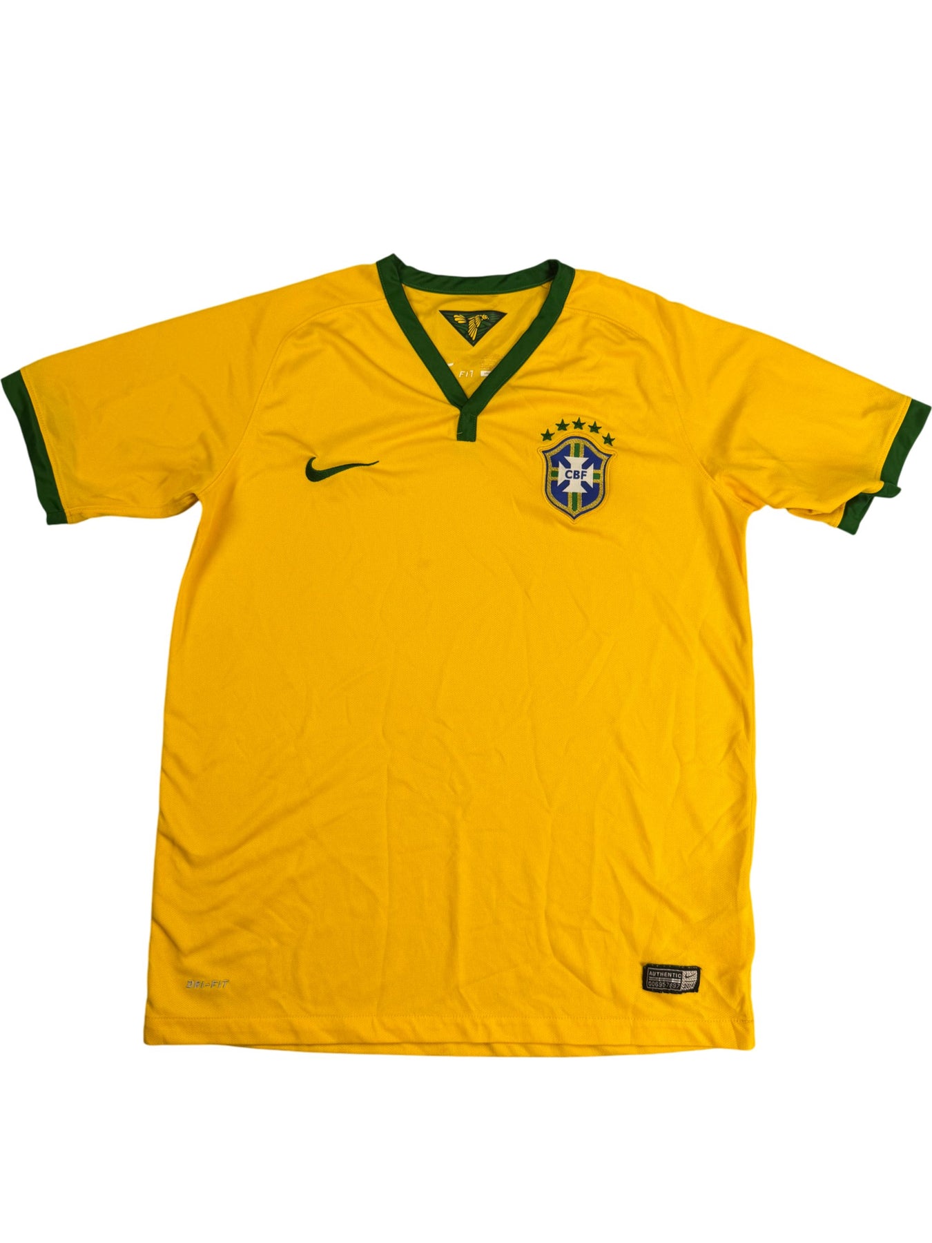 Authentic yellow sports jersey with green trims featuring the Brazil national football team crest. Made with moisture-wicking fabric for enhanced comfort.