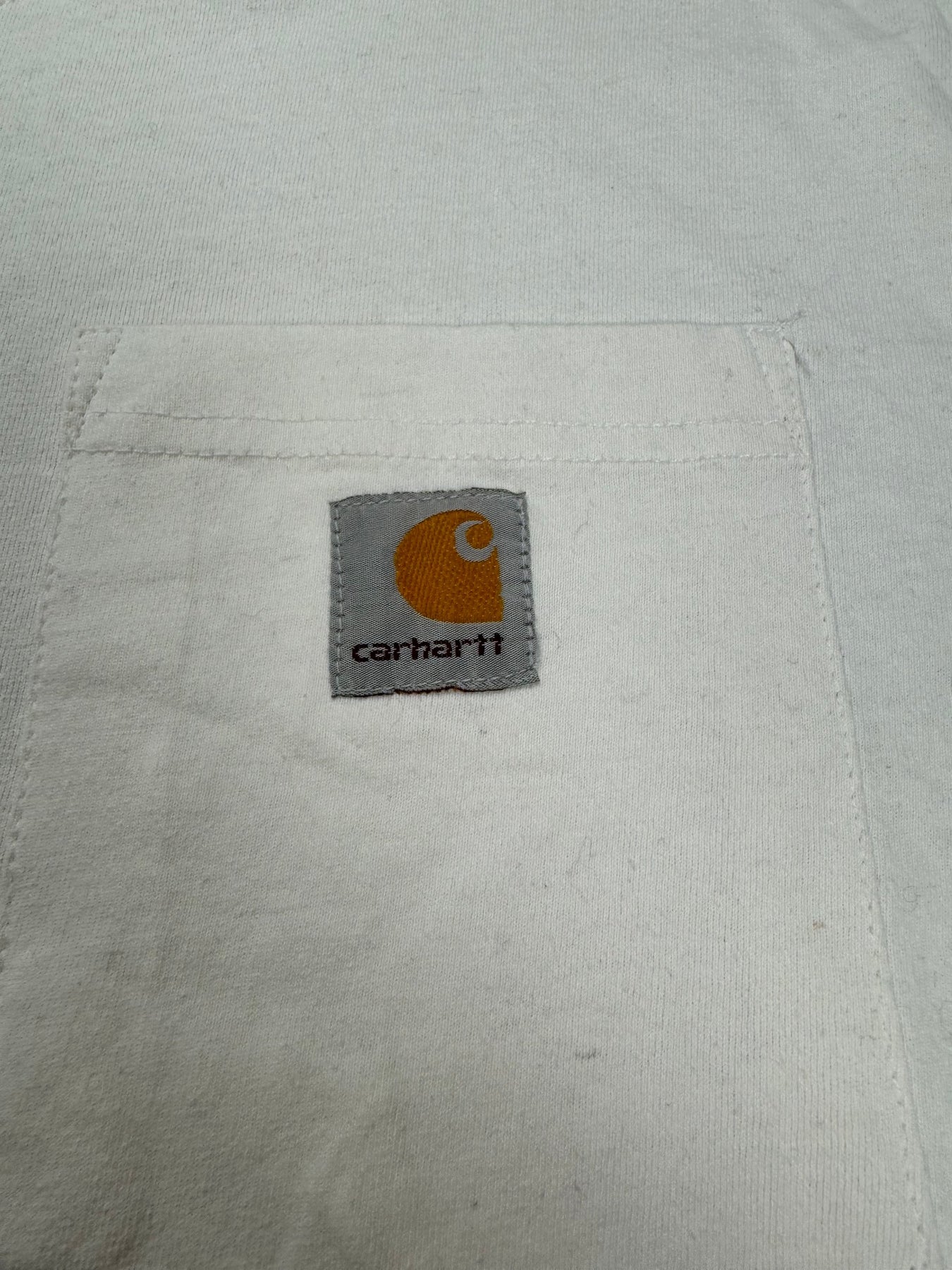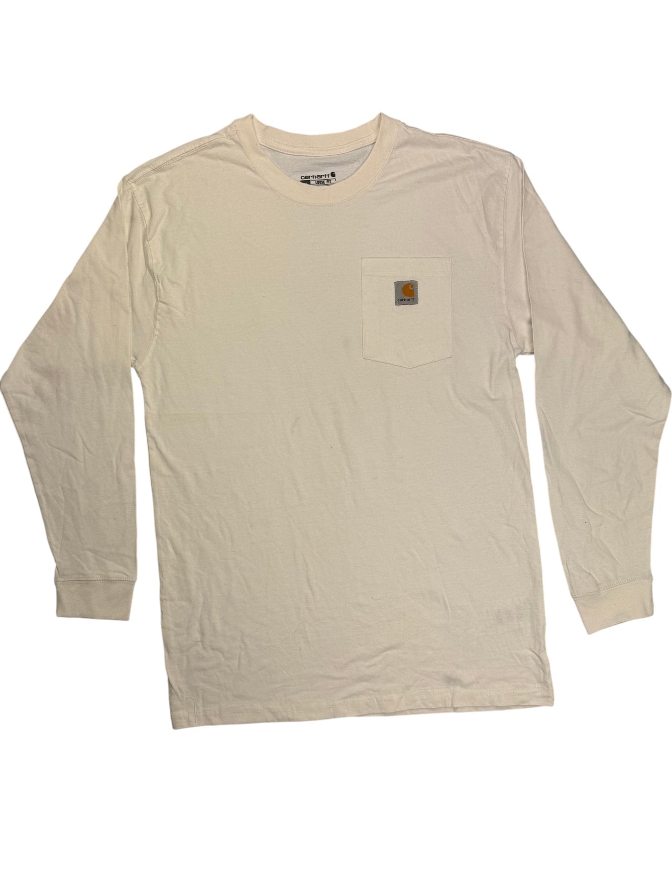 White long sleeve shirt made from 100% cotton with a loose fit. Features a chest pocket with Carhartt logo. Designed for durability and comfort.