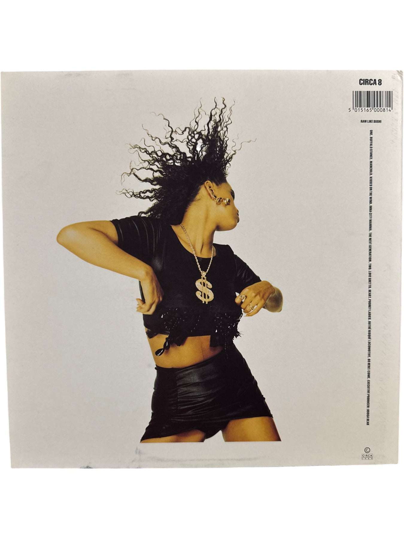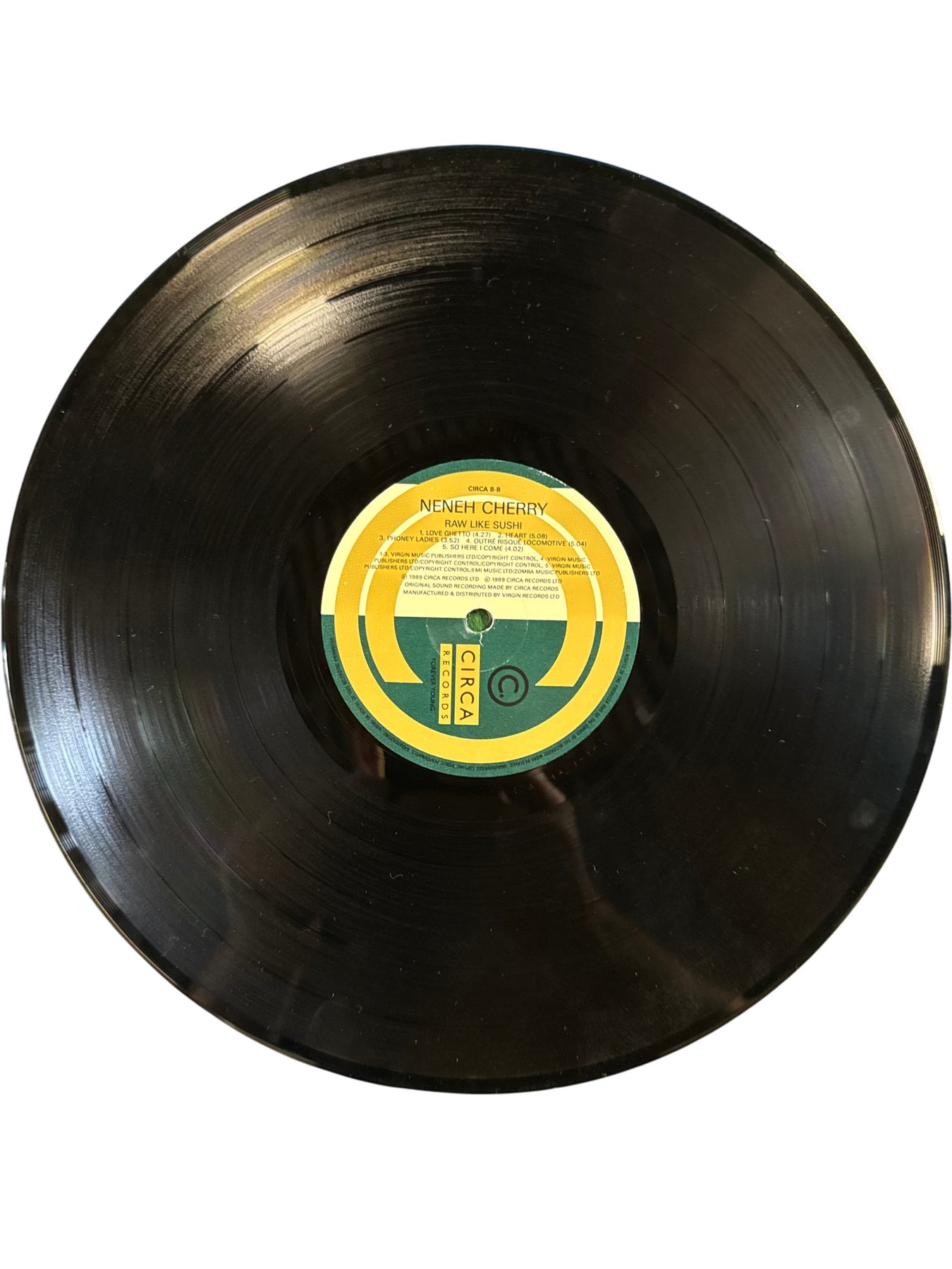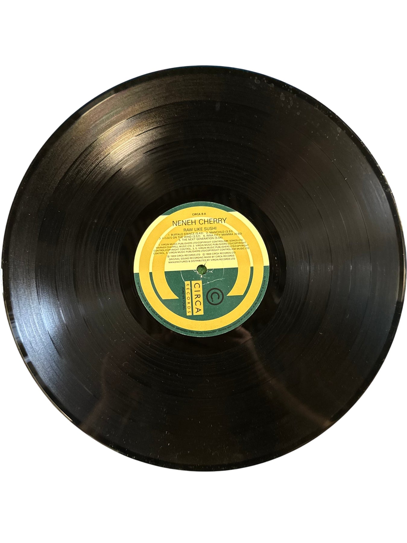 Vinyl record of Neneh Cherry's debut album 'Raw Like Sushi'. Released in 1989 by Circa Records. Features tracks including 'Buffalo Stance' and 'Manchild'.