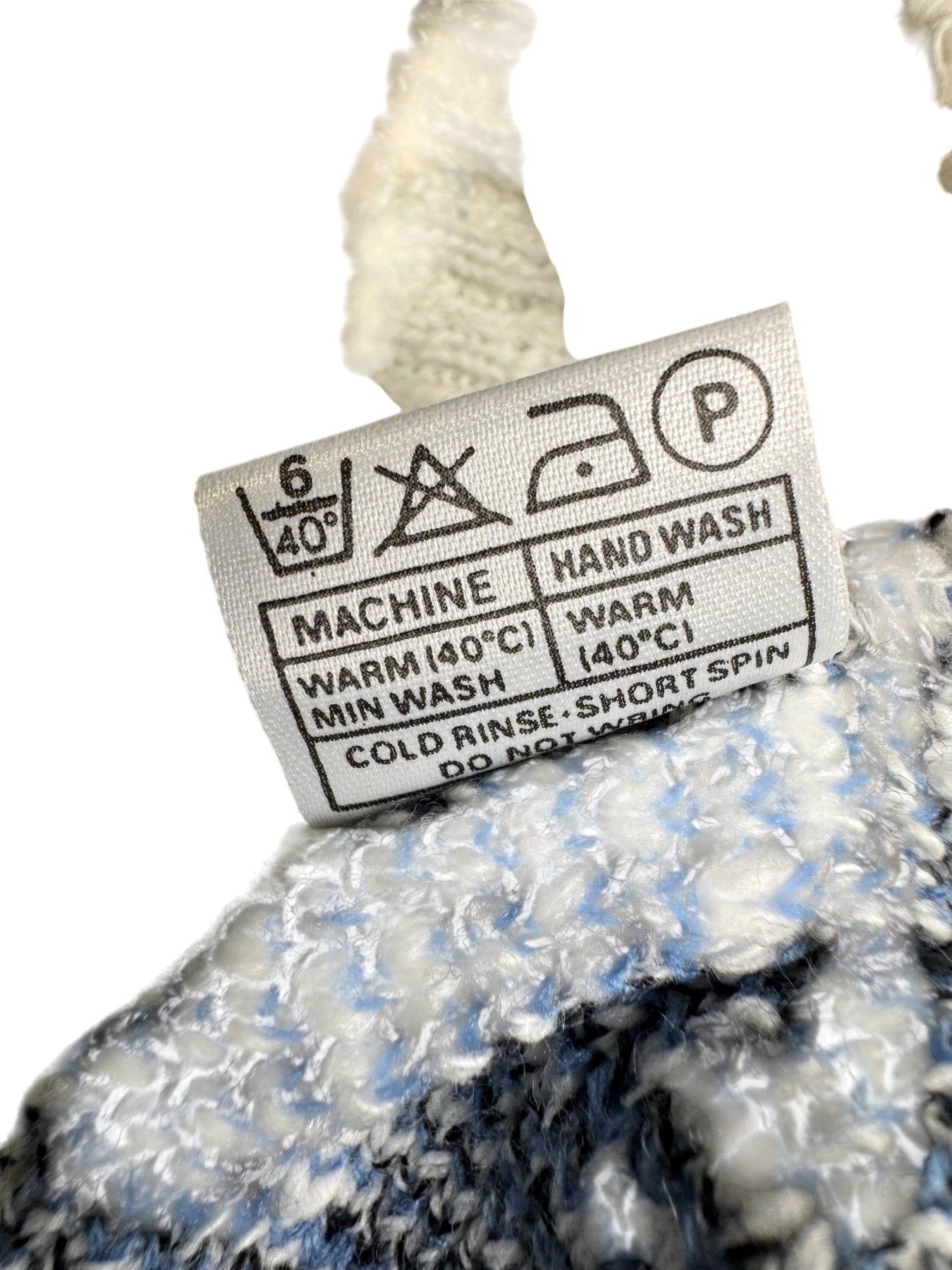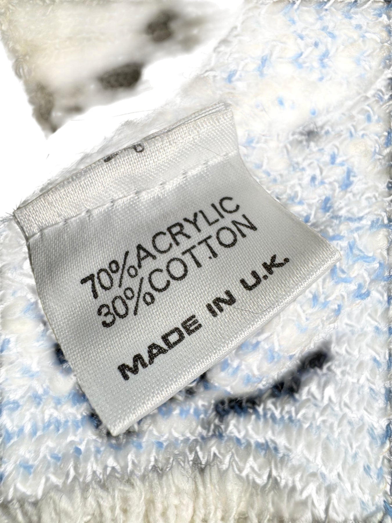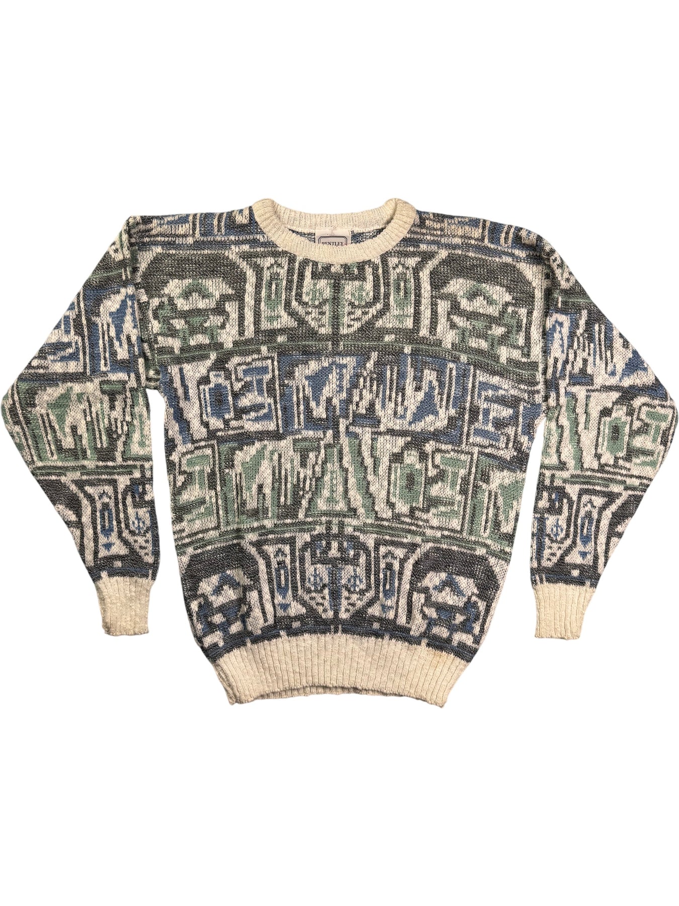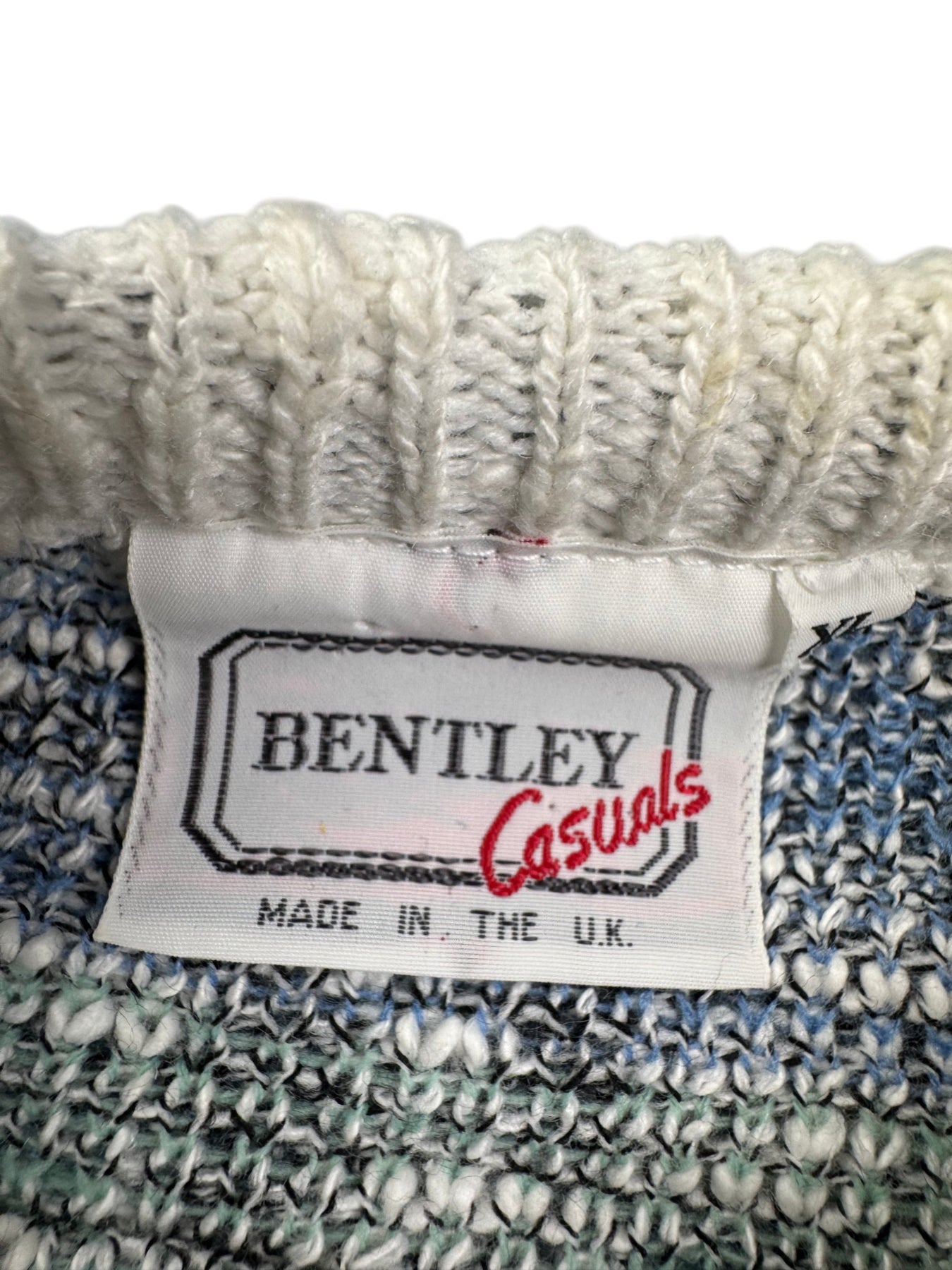 Acrylic and cotton blend sweater featuring a geometric pattern. Made by Bentley Casuals in the UK. Crew neckline with ribbed cuffs and hem.