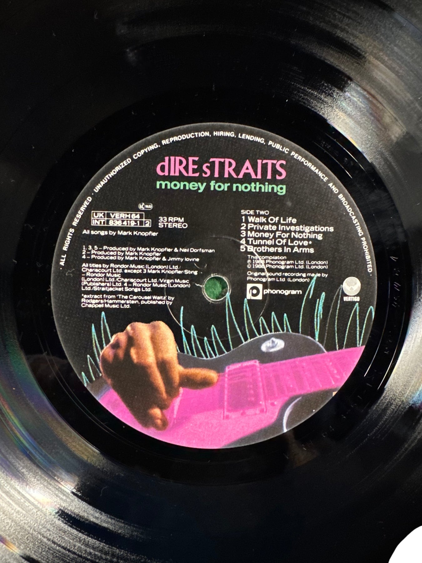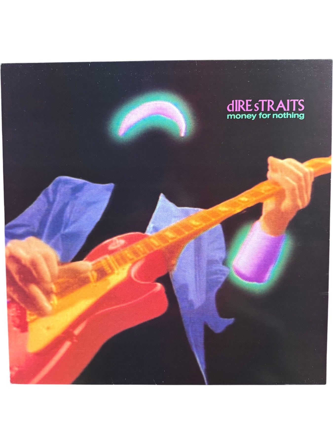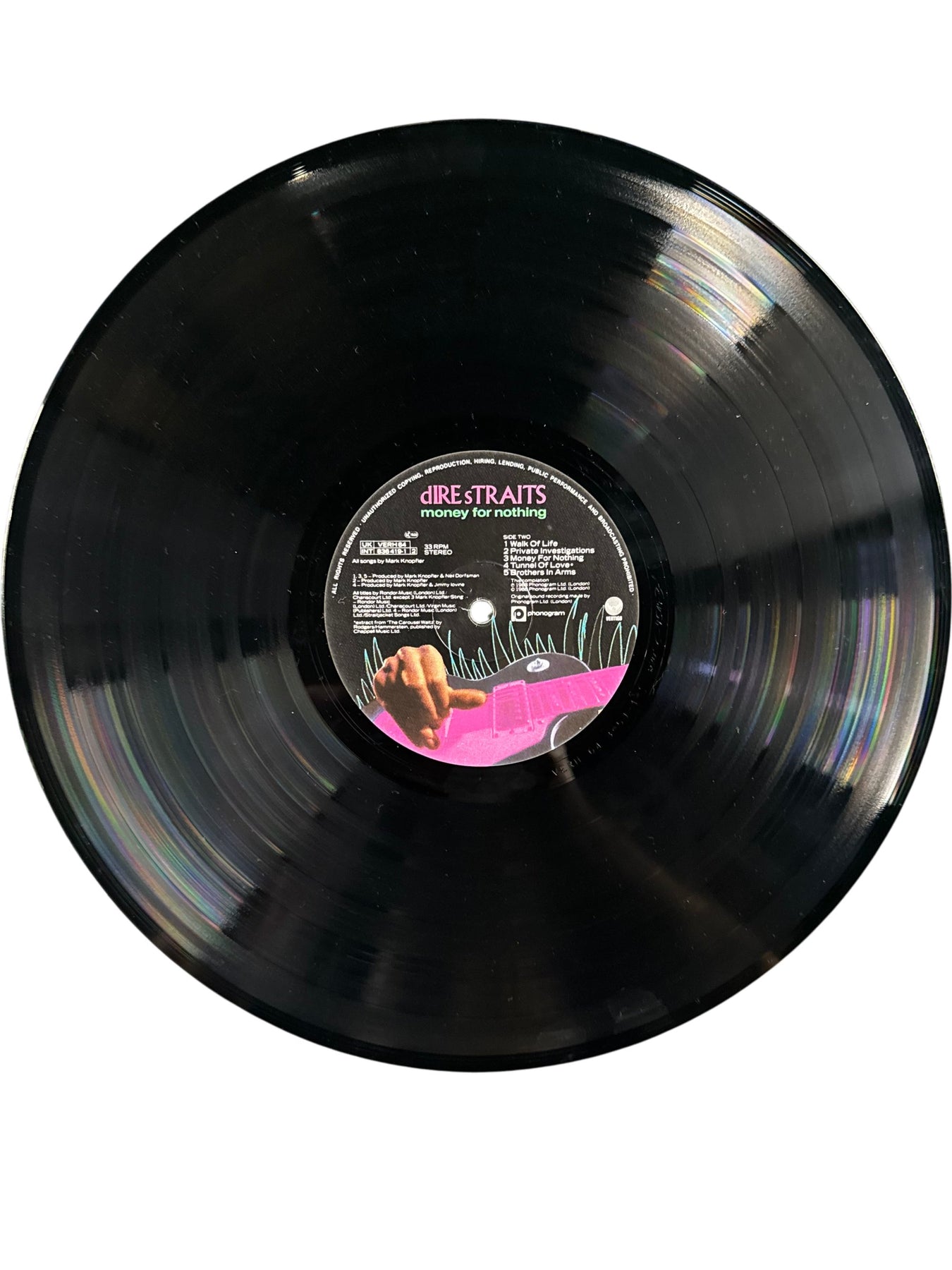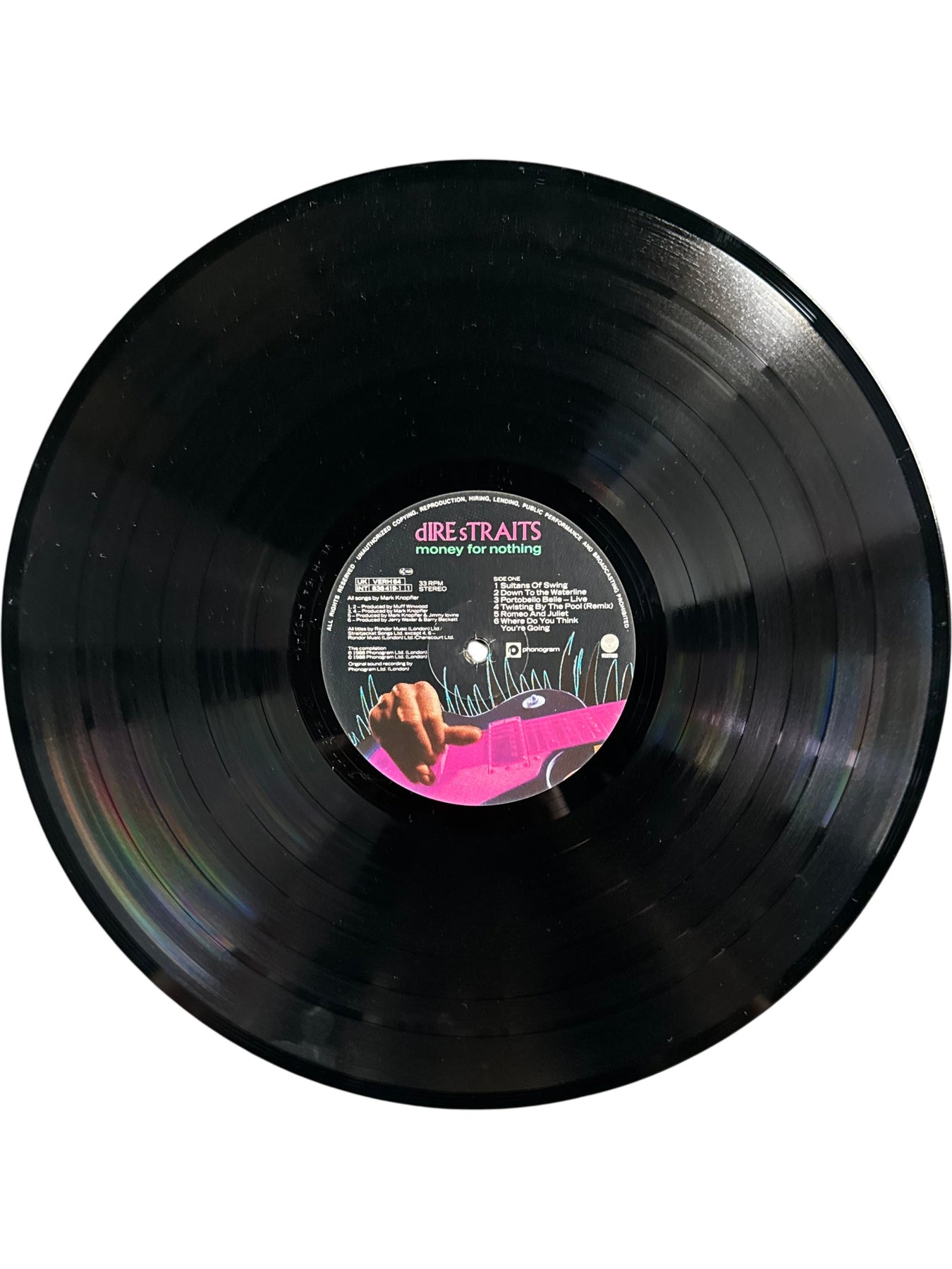 This is a vinyl record of Dire Straits' 'Money For Nothing'. The album features hit tracks like 'Sultans of Swing' and 'Money For Nothing'. The record is a compilation album produced by the band with contributions from well-known producers.