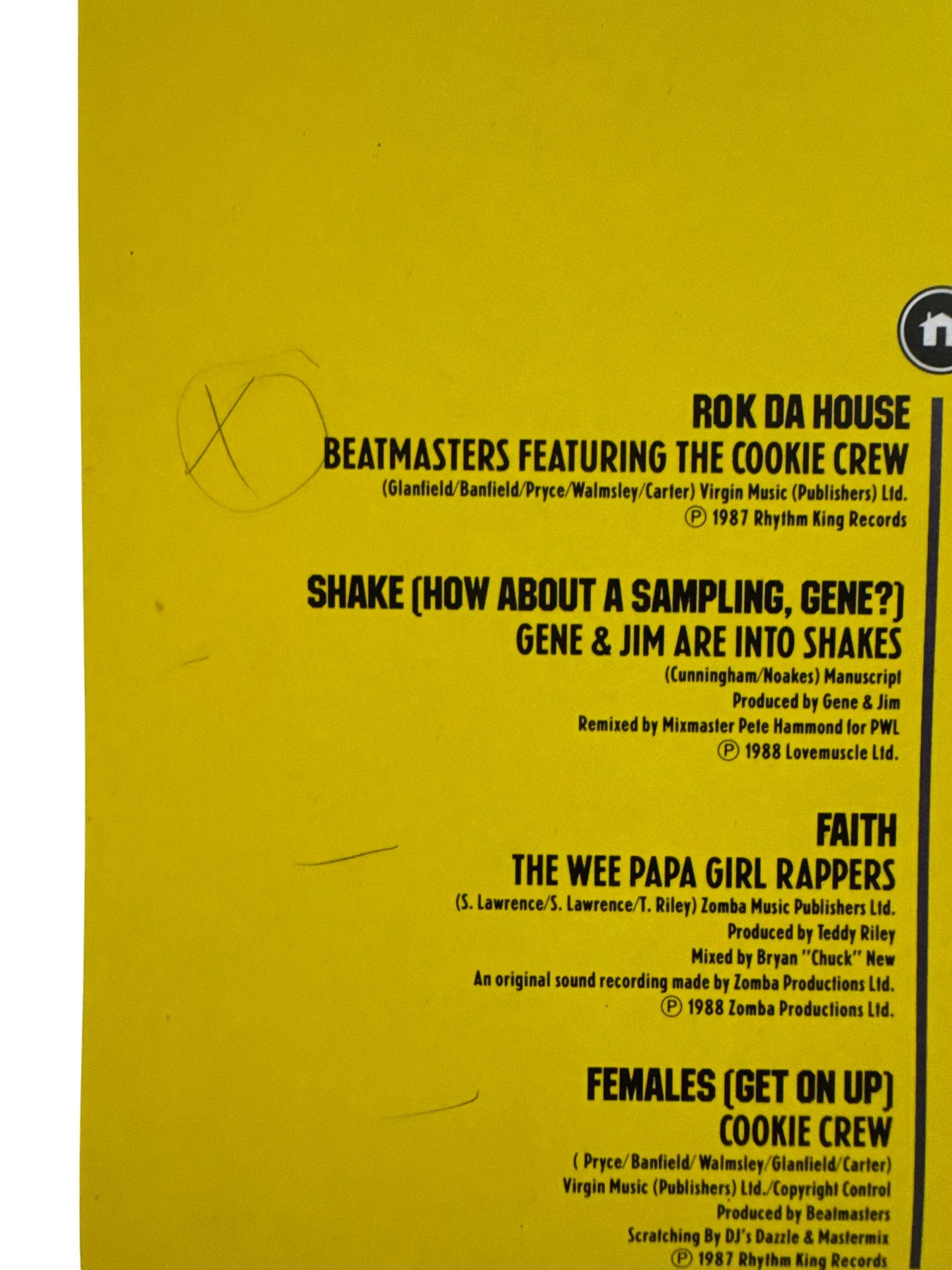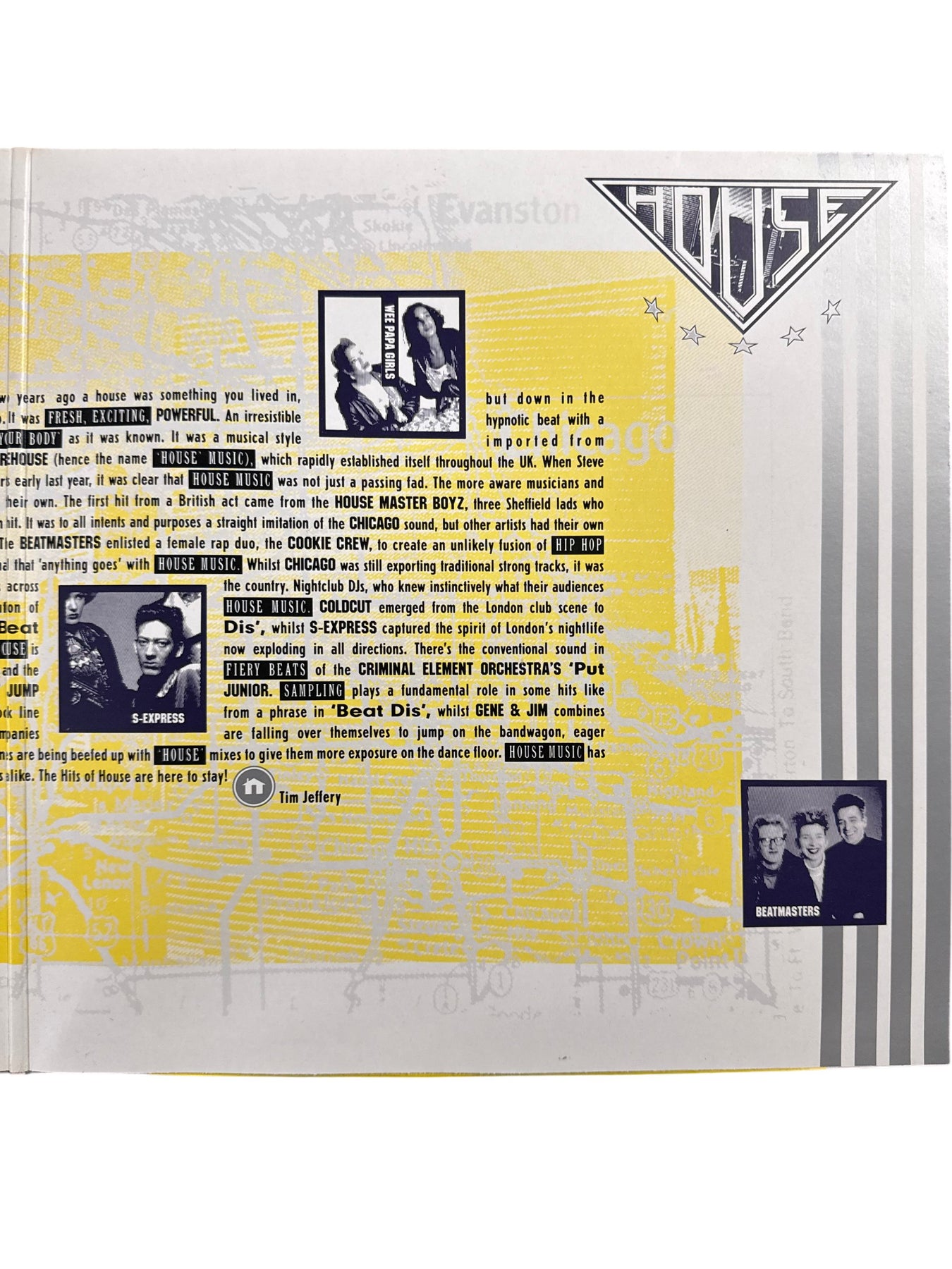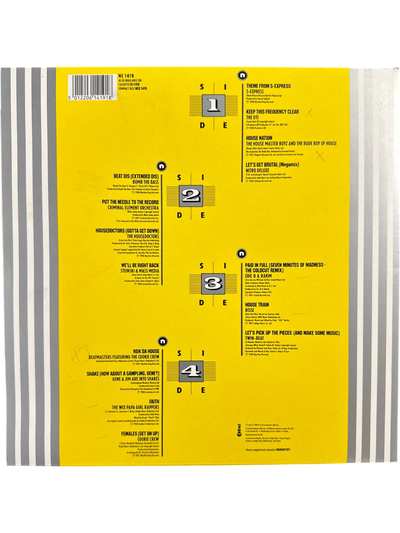 Double vinyl album featuring a collection of house music hits. Includes tracks from Bomb The Bass, Eric B and Rakim, and S-Express. Each record plays at 33 1/3 RPM stereo.