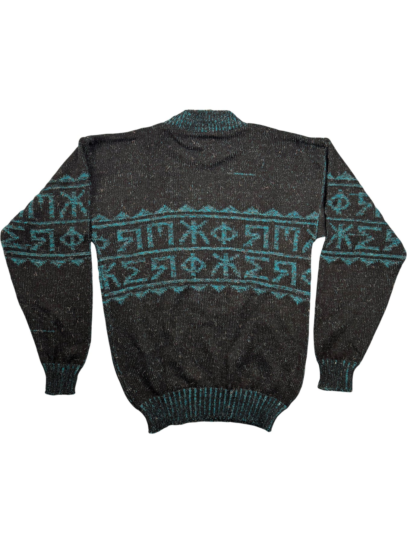Black and teal knit sweater with abstract pattern. Made in U.K., composed of 90% acrylic and 10% wool. Features ribbed cuffs and hem for a snug fit.