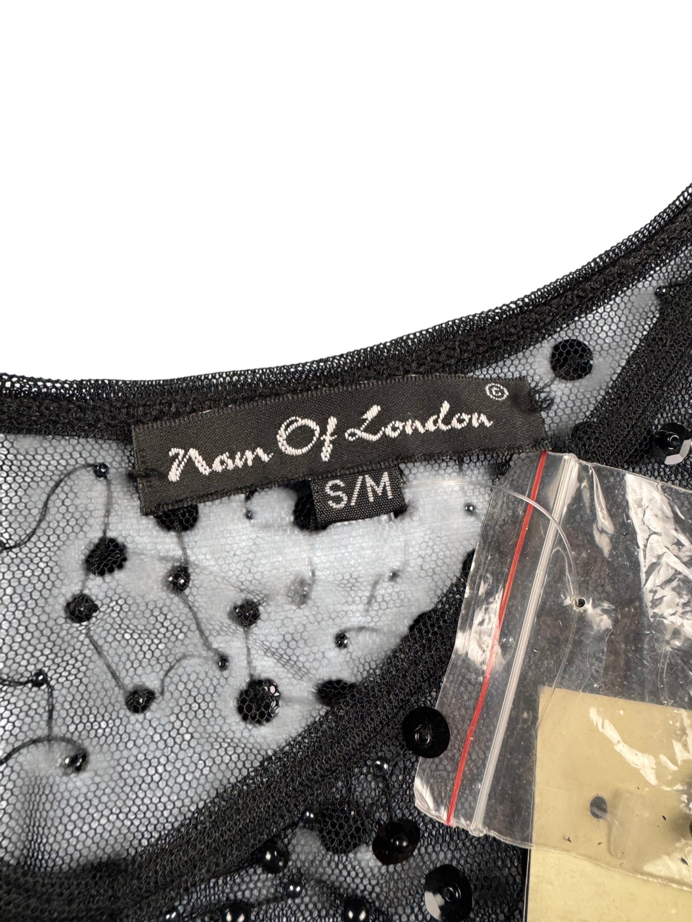 Sheer black blouse with intricate embellishments, featuring bead and sequin detailing. Long sleeves and a delicate fabric construction. Handmade luxury crochet knitwear by Nam of London.