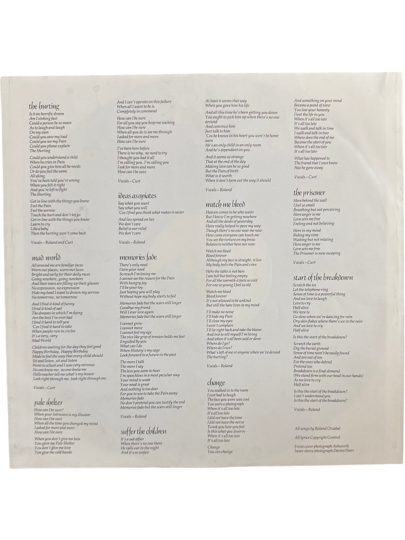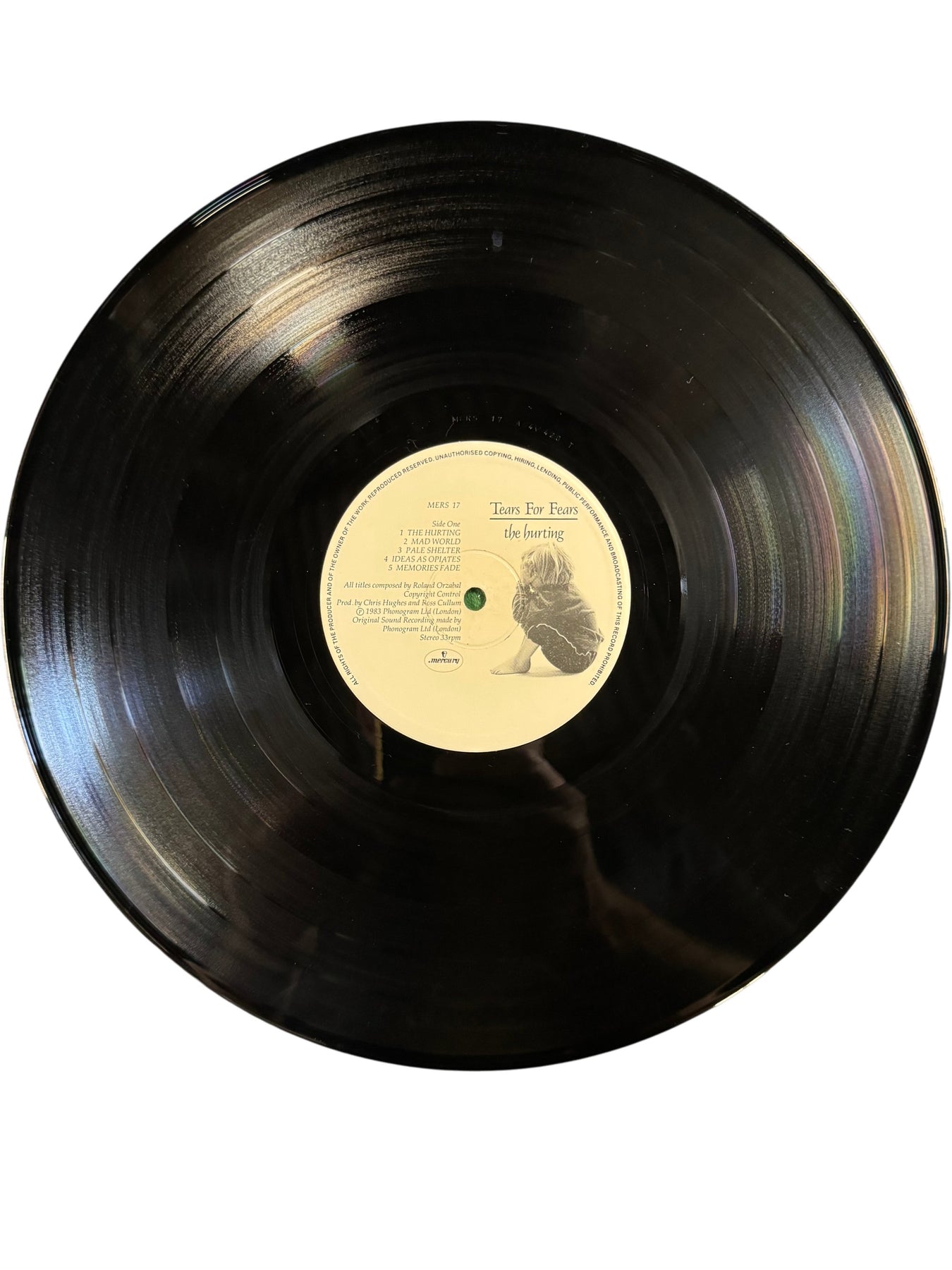 Vinyl record of 'The Hurting' by Tears For Fears. Includes tracks such as 'Mad World' and 'Pale Shelter'. Released under Mercury Records in 1983.