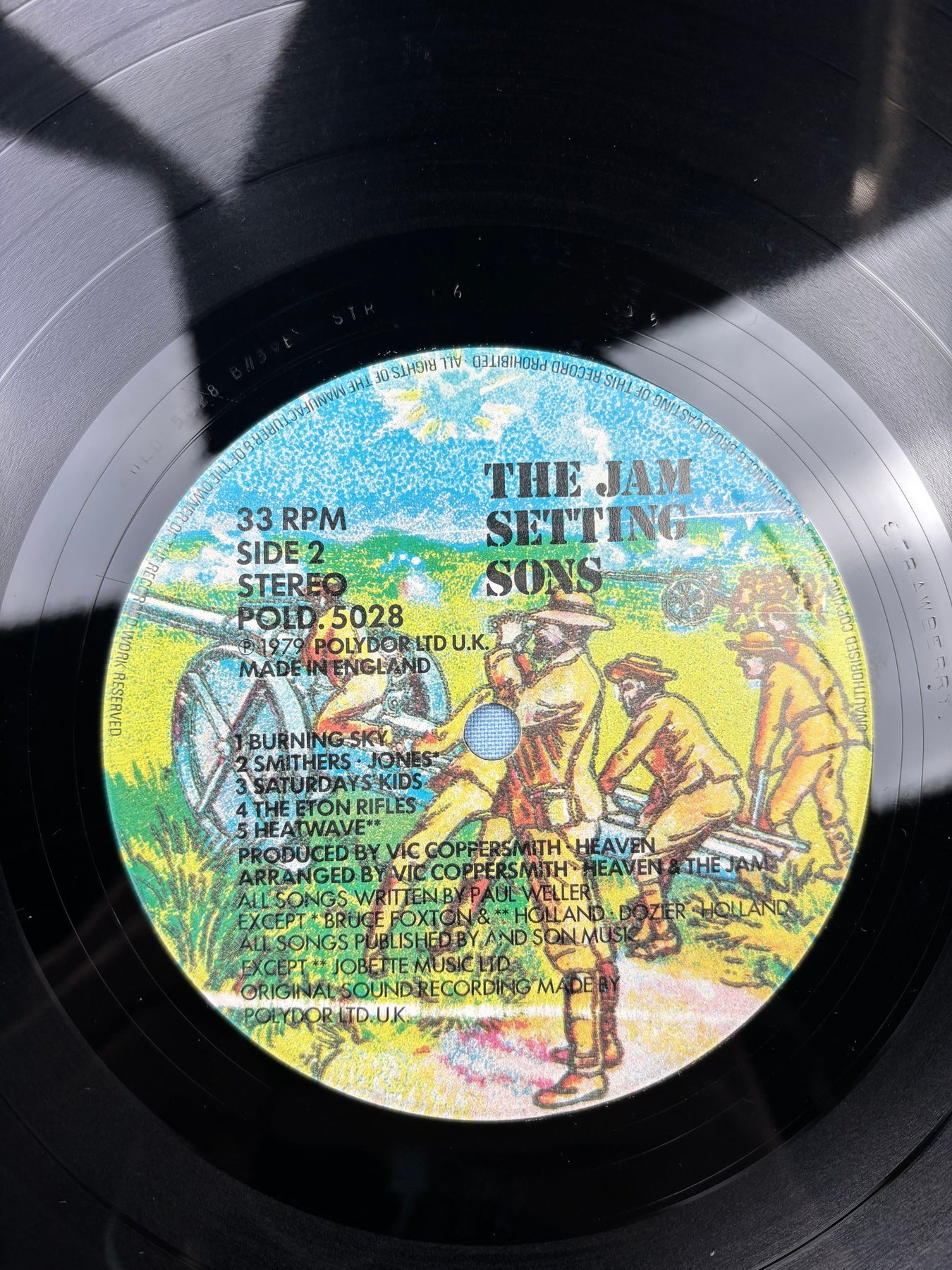 Vinyl album by The Jam titled 'Setting Sons'. Released by Polydor in 1979. Includes tracks like 'The Eton Rifles' and 'Wasteland'.
