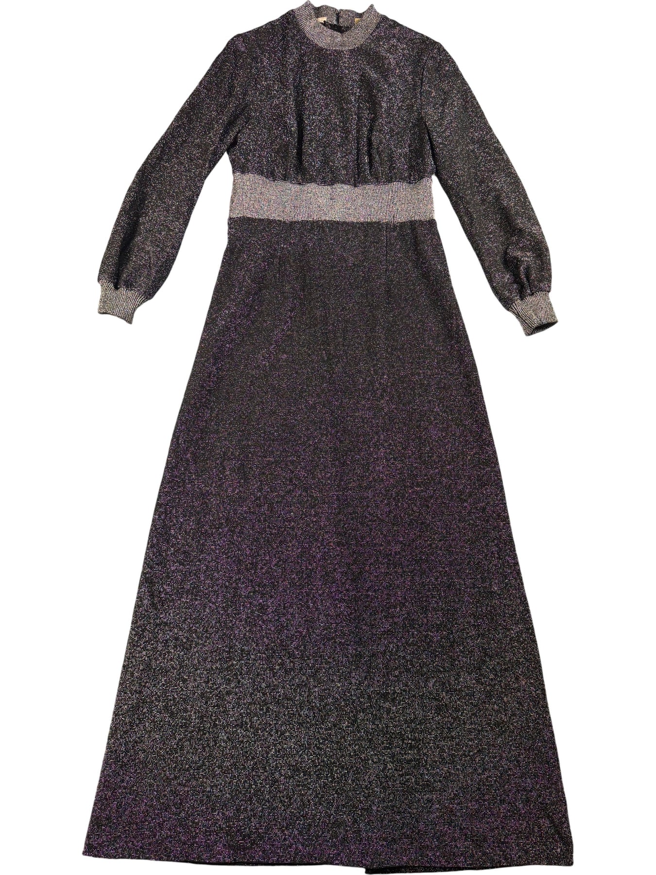 Shimmering metallic fabric with long sleeves. Fitted around the waist with stretchy cuffs and collar. Full-length maxi design.