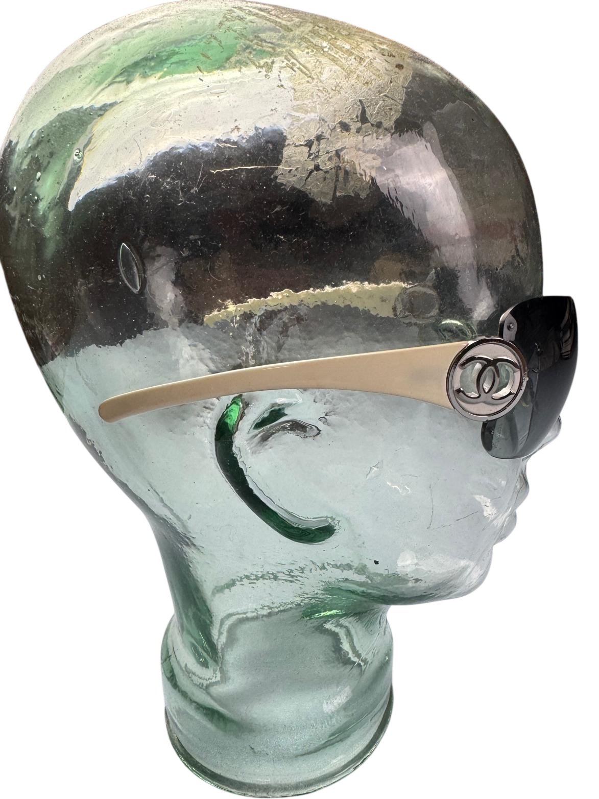 Chanel sunglasses with a sleek wraparound design. Black lenses with cream temples featuring the iconic Chanel logo. Made in France.