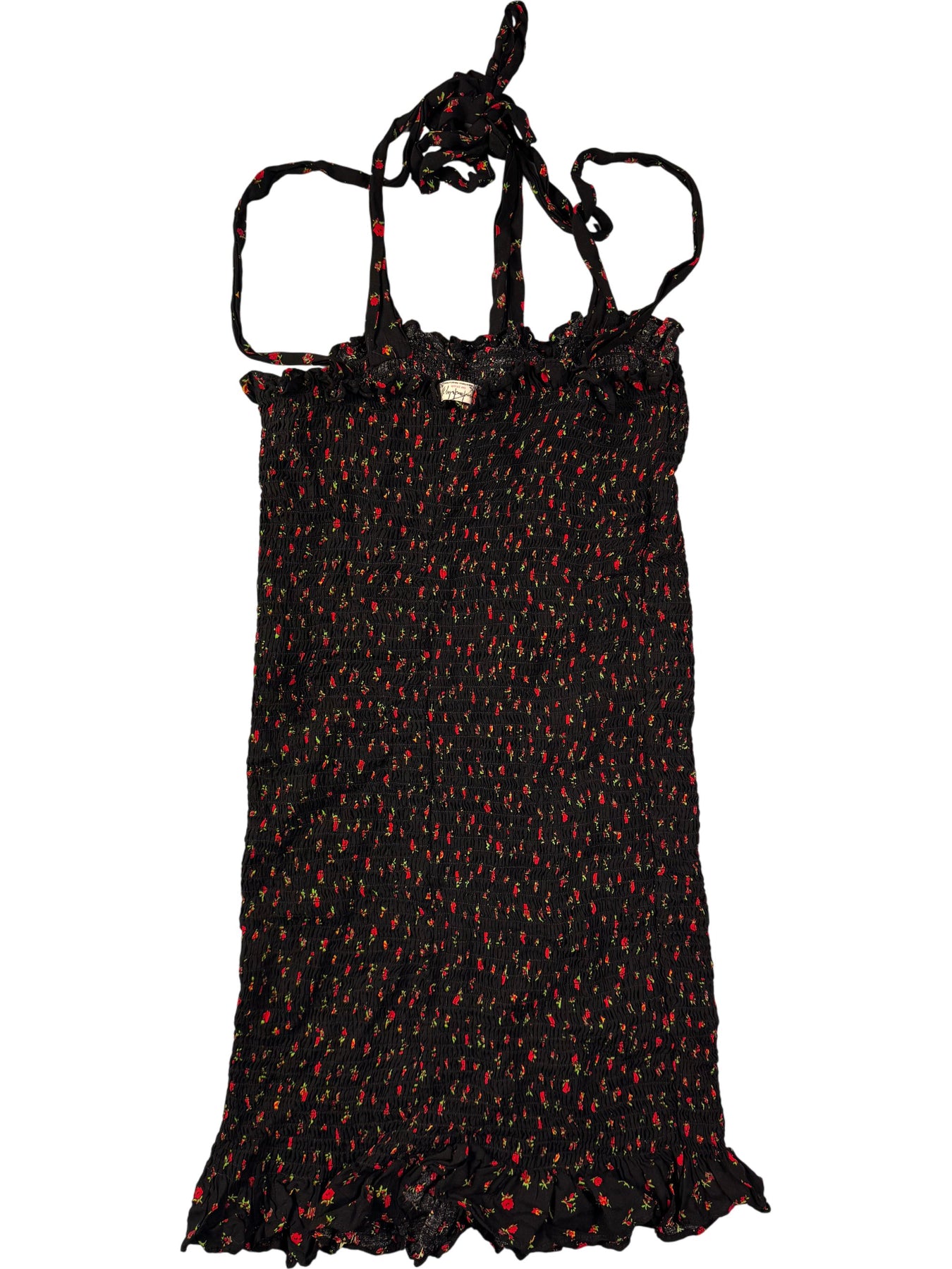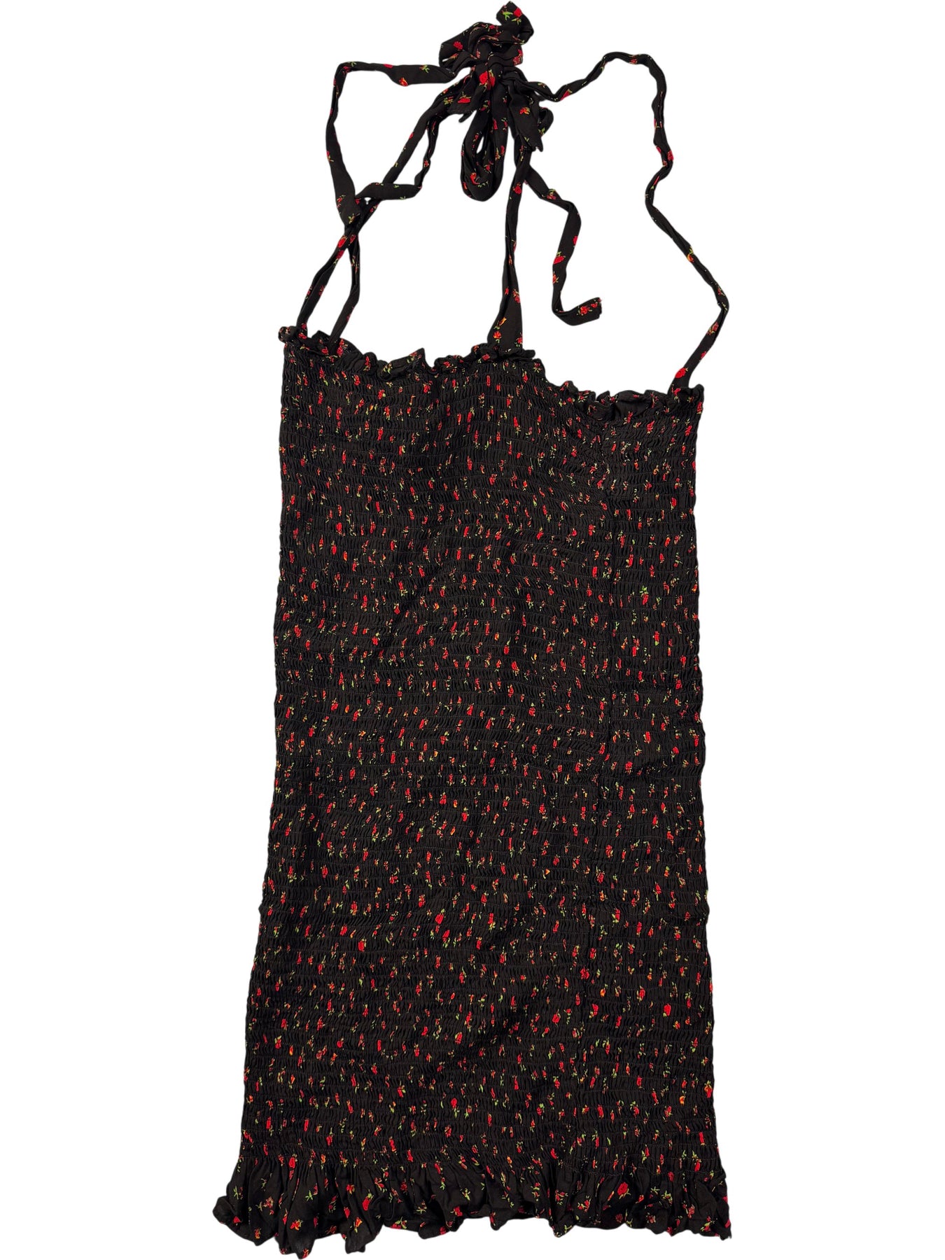 Black dress with floral pattern. Halter neck with tie straps. Elastic smocked texture throughout the body.