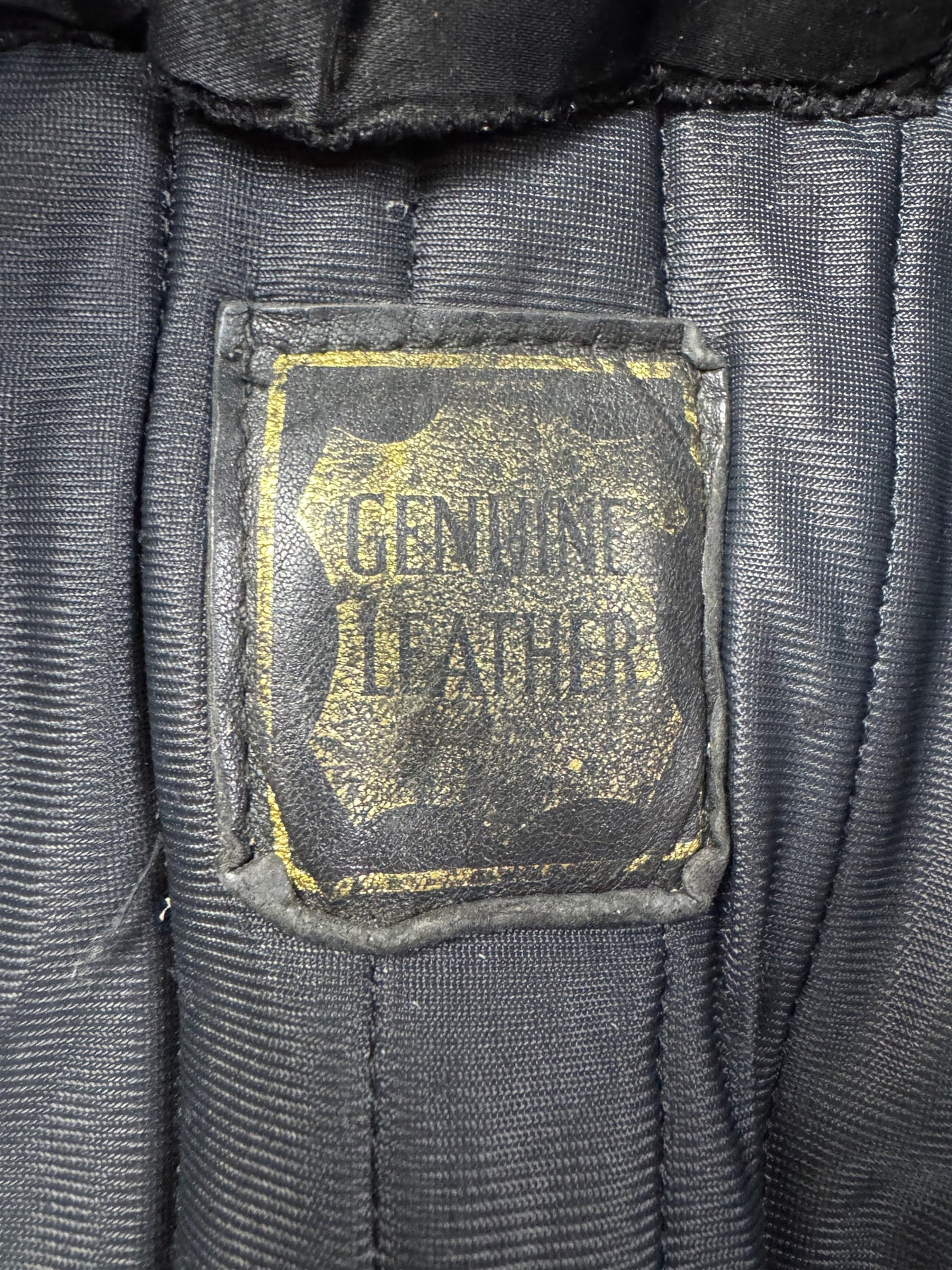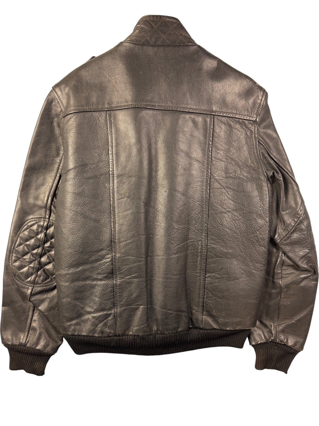 Genuine leather bomber jacket with quilted elbow patches, epaulettes on shoulders, and front flap pockets. Elasticated cuffs and hem for a snug fit.