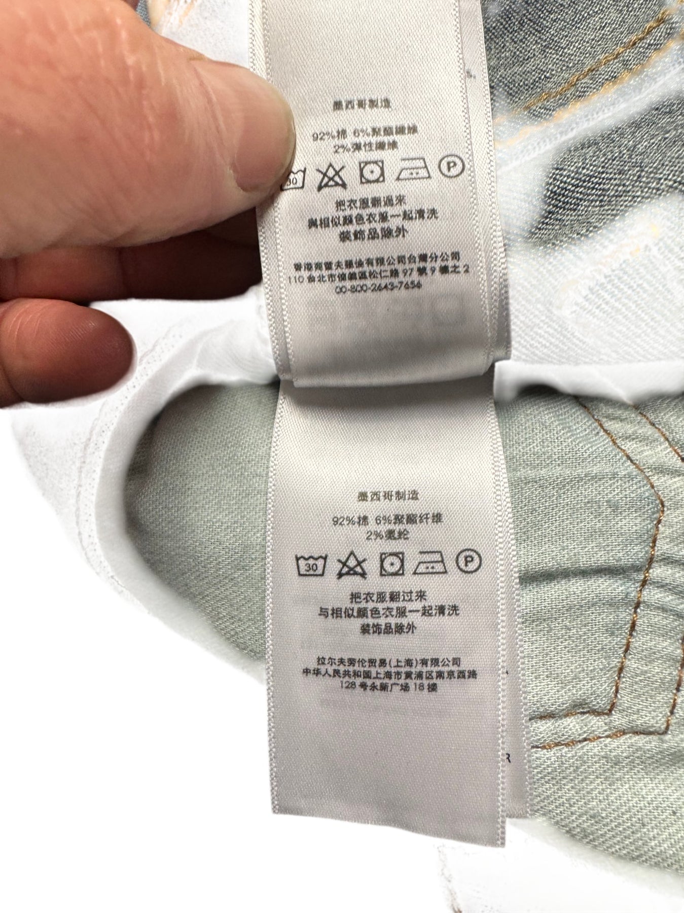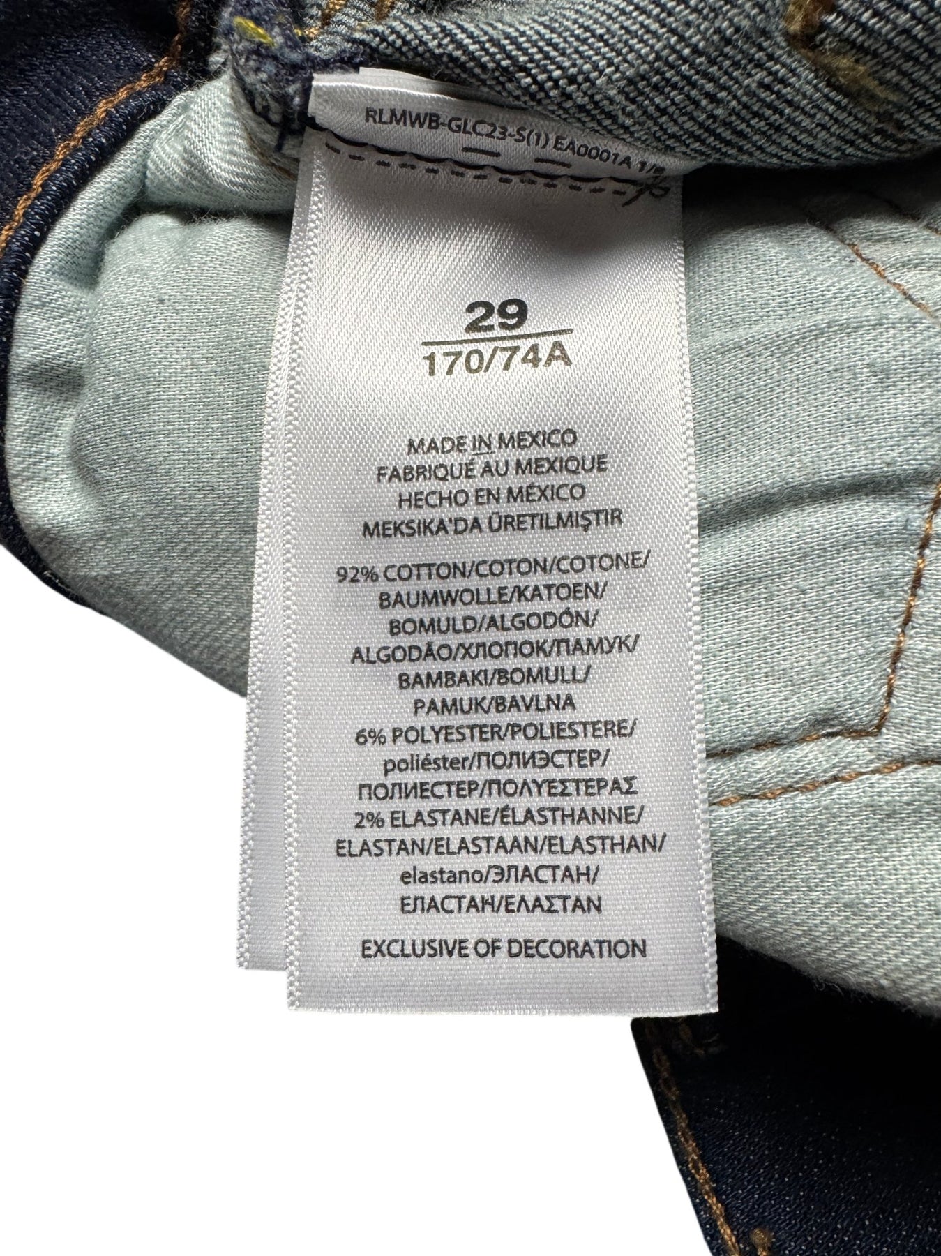 Made from 92% cotton, 6% polyester, and 2% elastane. Features a classic five-pocket style with a skinny leg design and signature branding on the waistband. Crafted in Mexico.